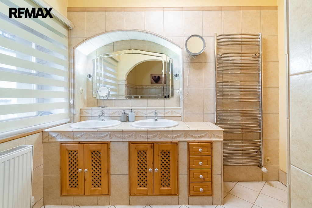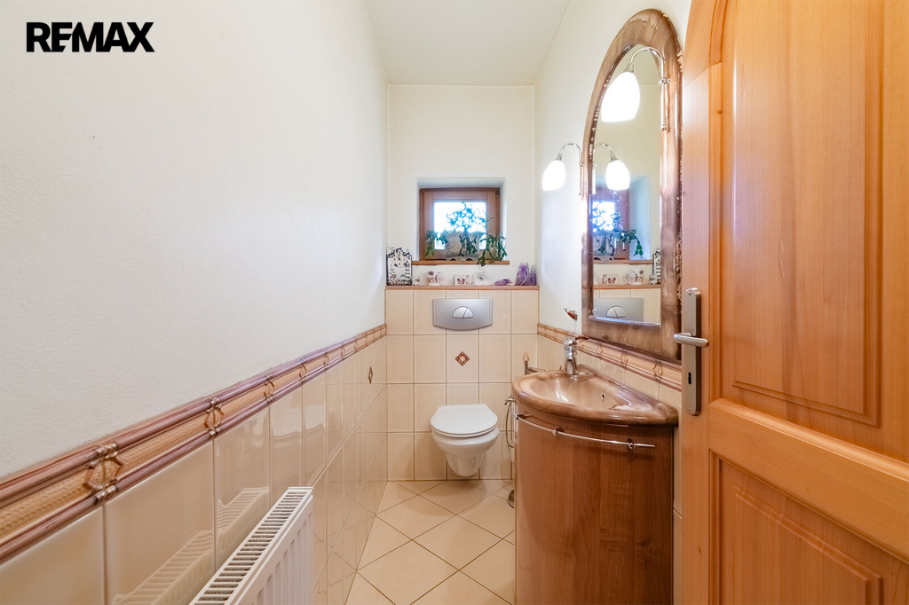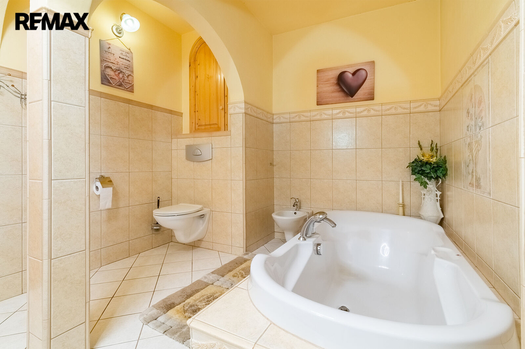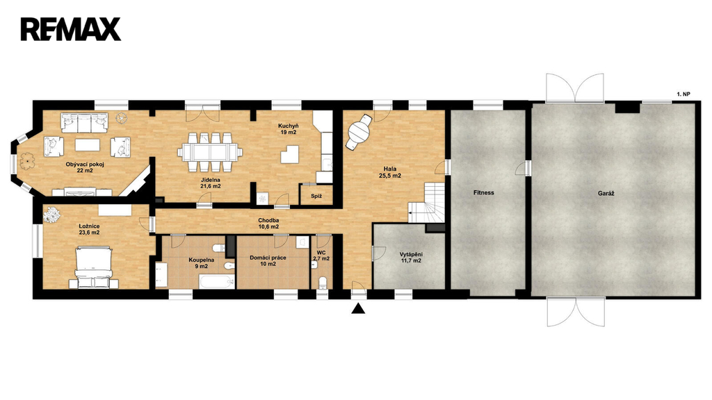 V 1.NP se nachází prostorná hala s krásným smrkovým schodištěm, fitness, technická místnost, ložnice, prádelna, samostatné wc a koupelna s vanou, bidetem a toaletou. Srdcem domu je otevřený prostor obývacího pokoje, kde je dominantou krb s francouzskou vložkou, moderní kuchyní s ostrůvkem a navazující jídelnou, ze které je možnost vejít na terasu. Zde je hotová příprava na zapuštěný bazén a najdeme tady dostatek prostoru k relaxaci a odpočinku.
