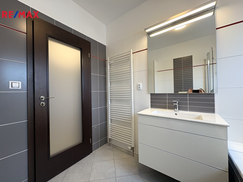 V 1. patře se nachází 3 samostatné pokoje, centrální chodba s vestavěnou skříní a velká koupelna s vanou, umyvadlem a toaletou.