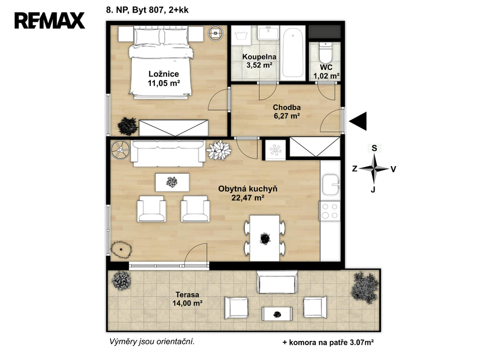 Celková výměra: 63,27 M²: BYT 46,2M² + 3,07 M² KOMORA + 14M² TERASA
