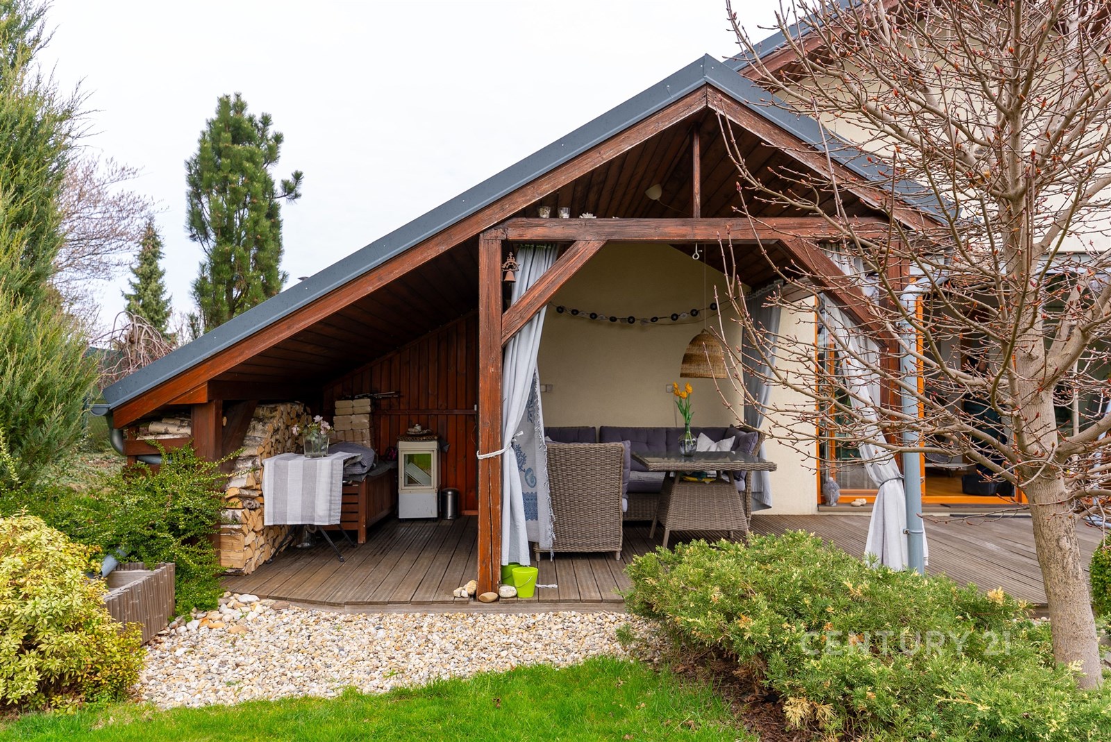 • Zastřešená terasa: Prostorné místo pro setkávání, které je z poloviny kryté před deštěm i sluncem.