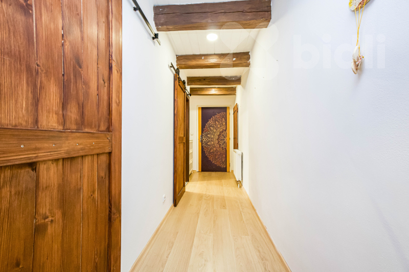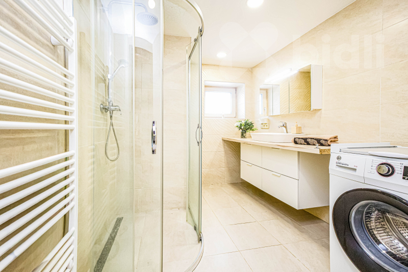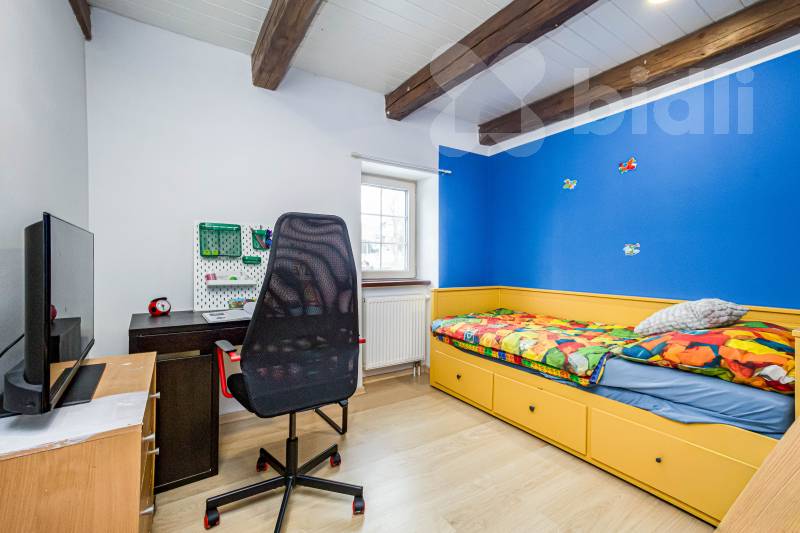 Tato část domu má samostatný vstup. Byt nabízí koupelnu se sprchovým koutem s prostorem pro pračku, samostatný pokoj vhodný jako ložnice či dětský pokoj a světlý obývací pokoj s kuchyňským koutem, který je prakticky oddělen kuchyňským pultem.