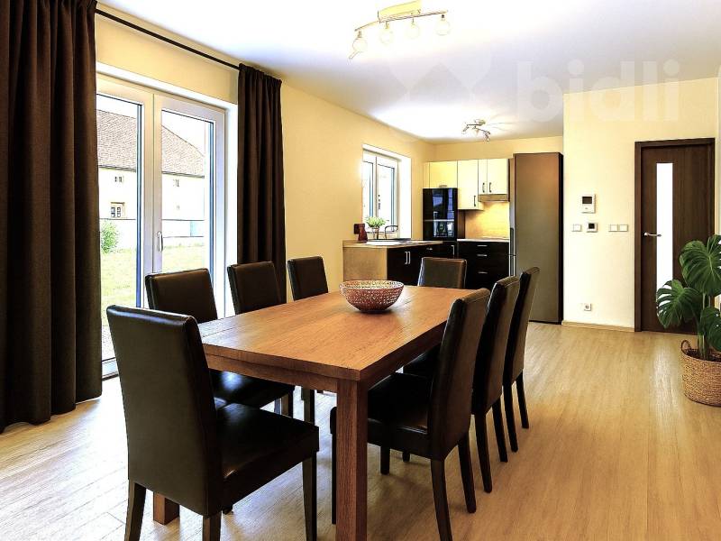 Velkou předností domu je velmi úsporný provoz a energetický štítek B. Vytápění je příjemné podlahové, řešené pomocí tepelného čerpadla. Cirkulaci vzduchu navíc podporuje rekuperace.