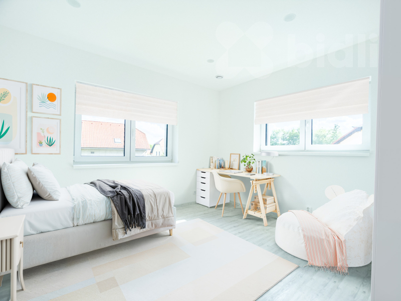 Společenské místnosti jsou situovány v přízemí domu, velkorysý prostor tu vzájemně propojuje kuchyni, jídelnu a obývací pokoj, francouzské okno navíc prostory otvírá k venkovní terase. V inzerci jsou použity vizualizace pro lepší představu o možnosti zařízení pokojů. U vstupu do domu je šatní skříň a koupelna s toaletou a sprchovým koutem a dále technická místnost. V patře jsou pak tři neprůchozí ložnice, koupelna s vanou, samostatné WC a komora. Po výsuvném schodišti je navíc přístupné podkroví domu, které lze rovněž využít.