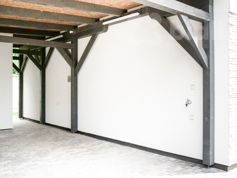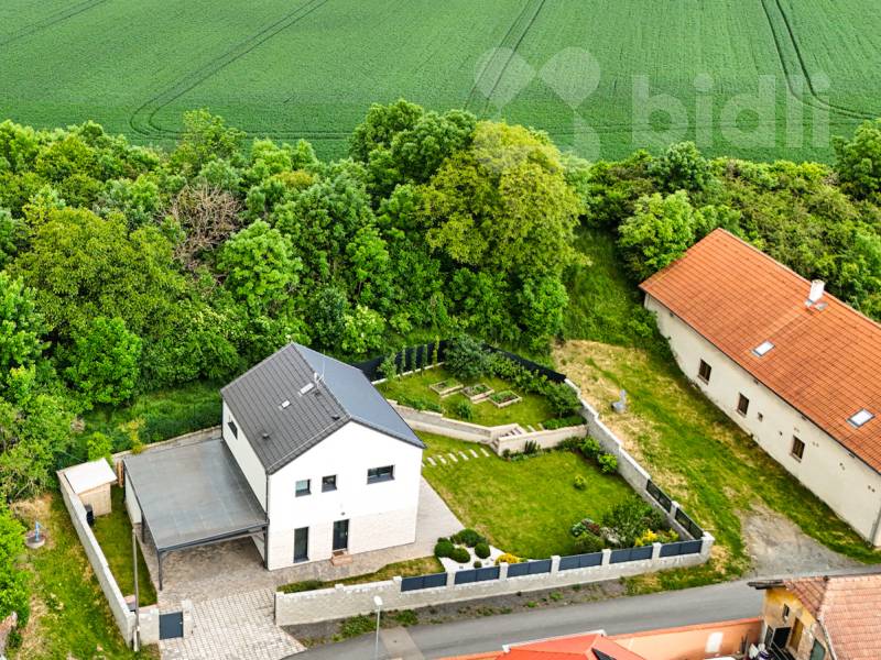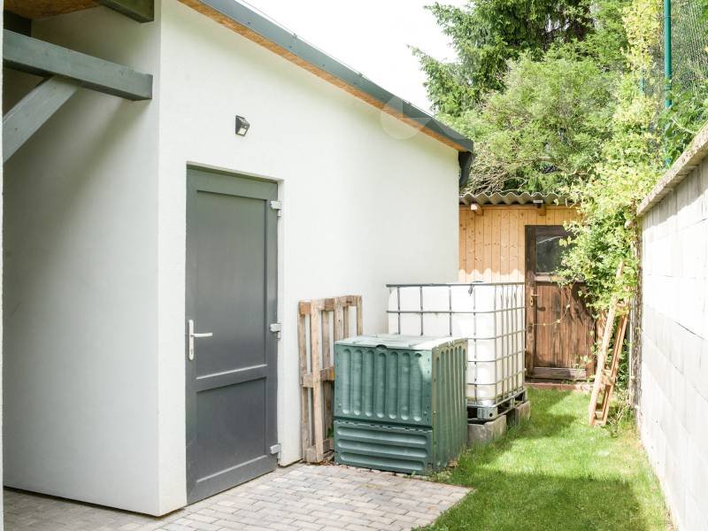 K domu přiléhá kryté parkovací stání pro 2 vozidla a dva zahradní domky. K relaxaci a odpočinku slouží terasa o rozloze 40 m2, která nabízí krásný výhled do zahrady s automatickou závlahou využívající retenční nádrž na dešťovou vodu.