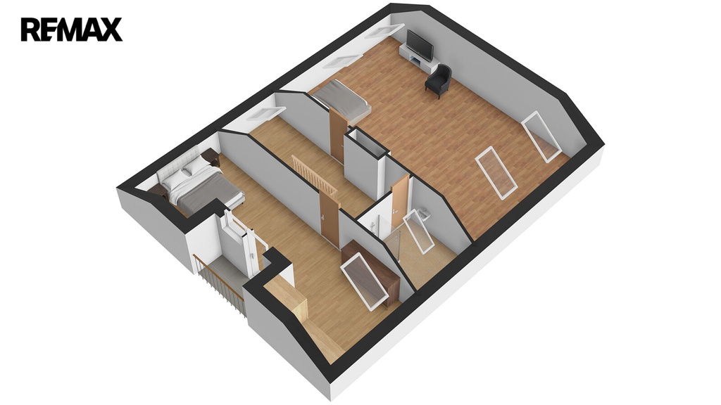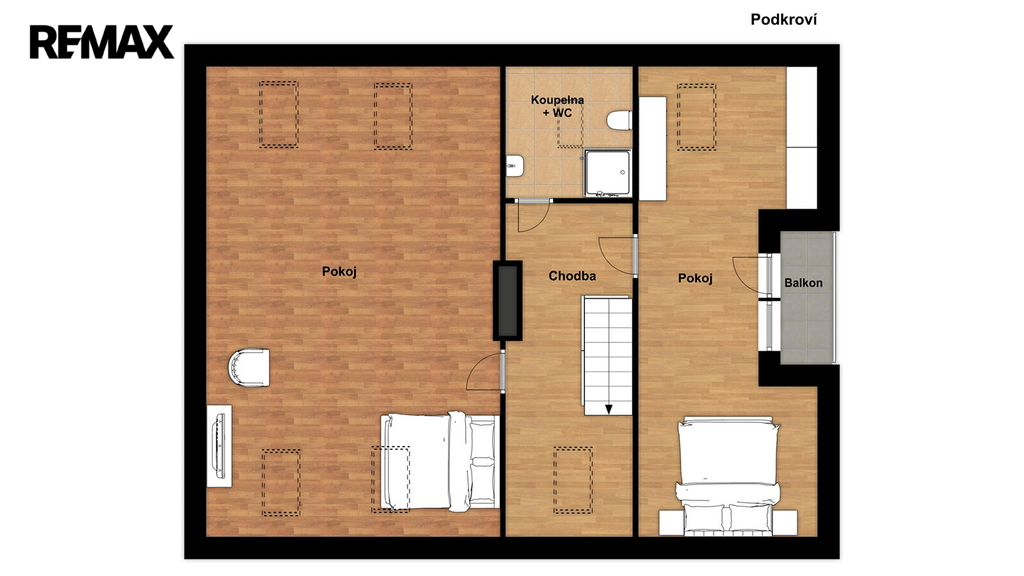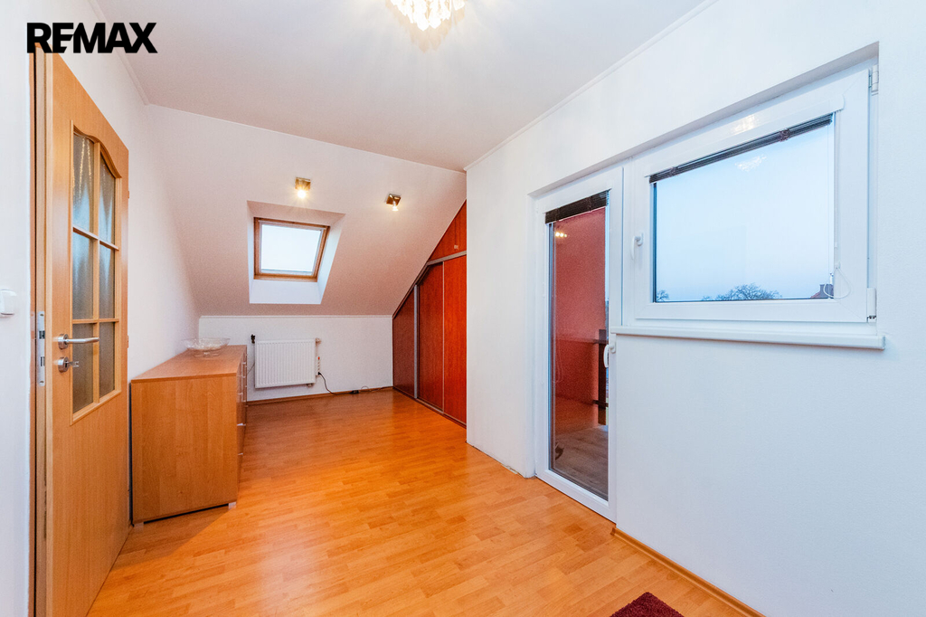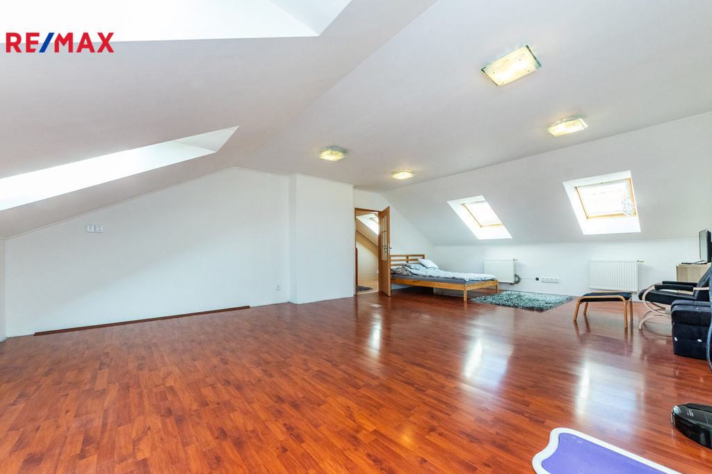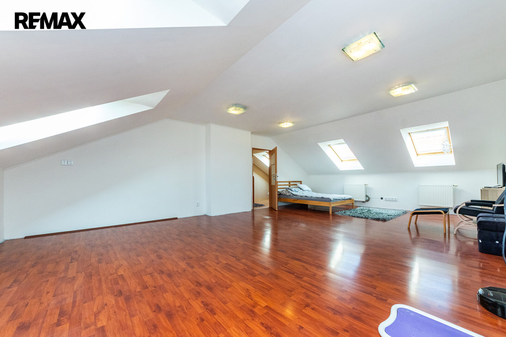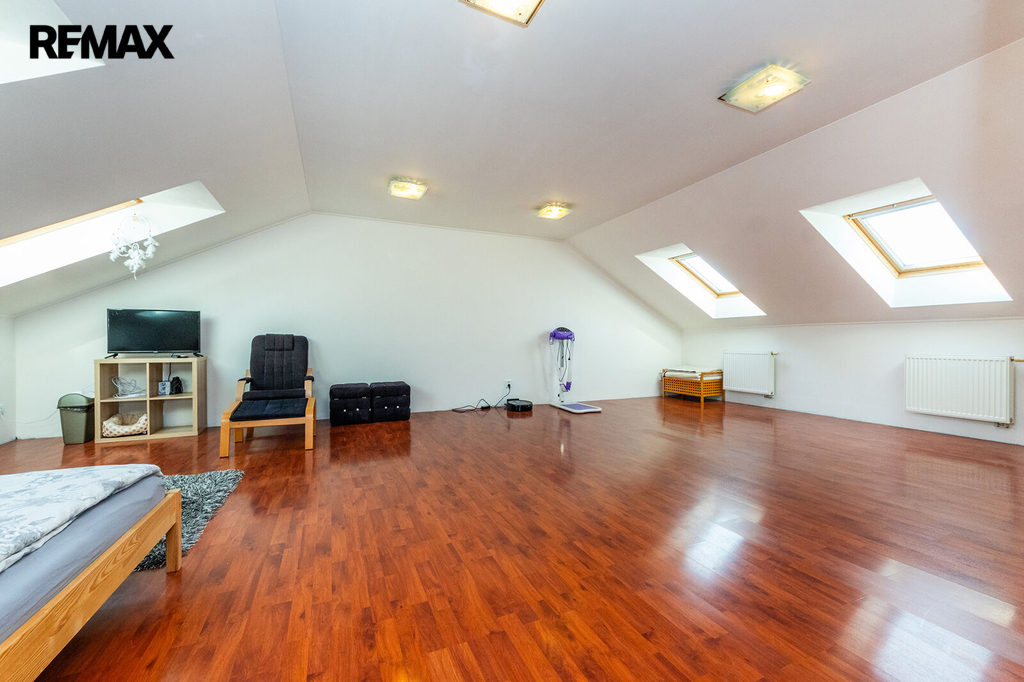 Podkroví: prostorný obytný prostor s přípravou na kuchyň, ložnice s lodžií, koupelna se sprchovým koutem a toaletou, střešní okna Velux zajišťující dostatek denního světla