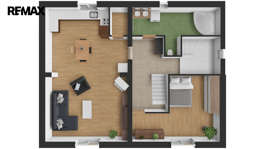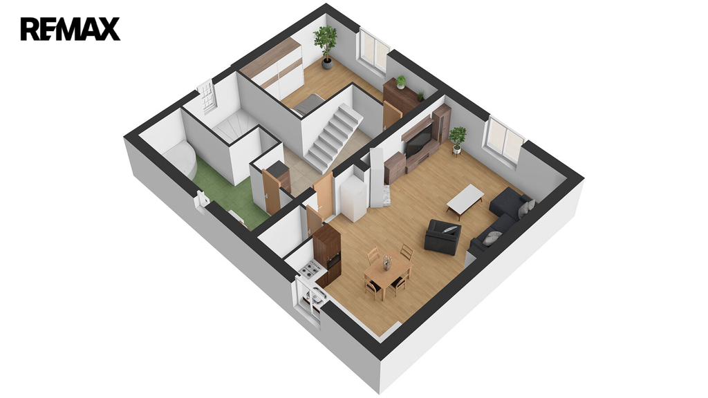 1. NP: vstupní chodba, kuchyň, obývací pokoj, ložnice, koupelna se sprchovým koutem a toaletou, spíž a vstup do sklepa