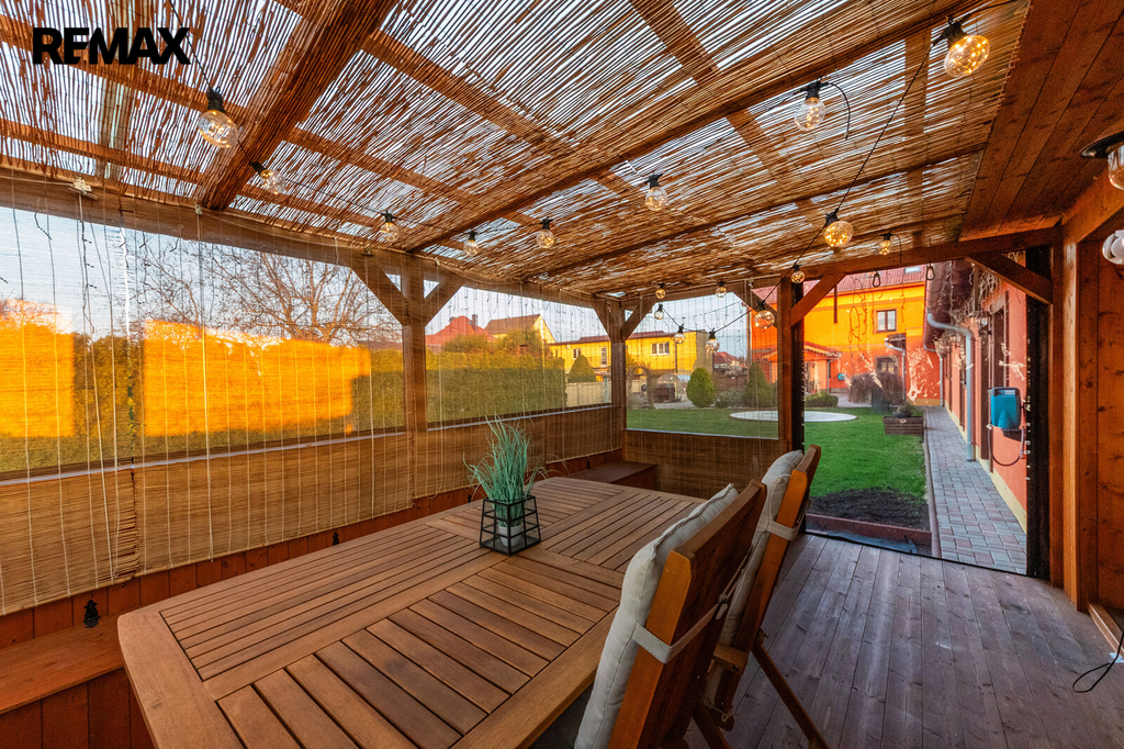 Zahrada navržená zahradním architektem nabízí příjemné soukromí, altán pro venkovní posezení i retenční nádrž na dešťovou vodu o objemu 30 m³ s tlakovým čerpadlem pro zavlažování.