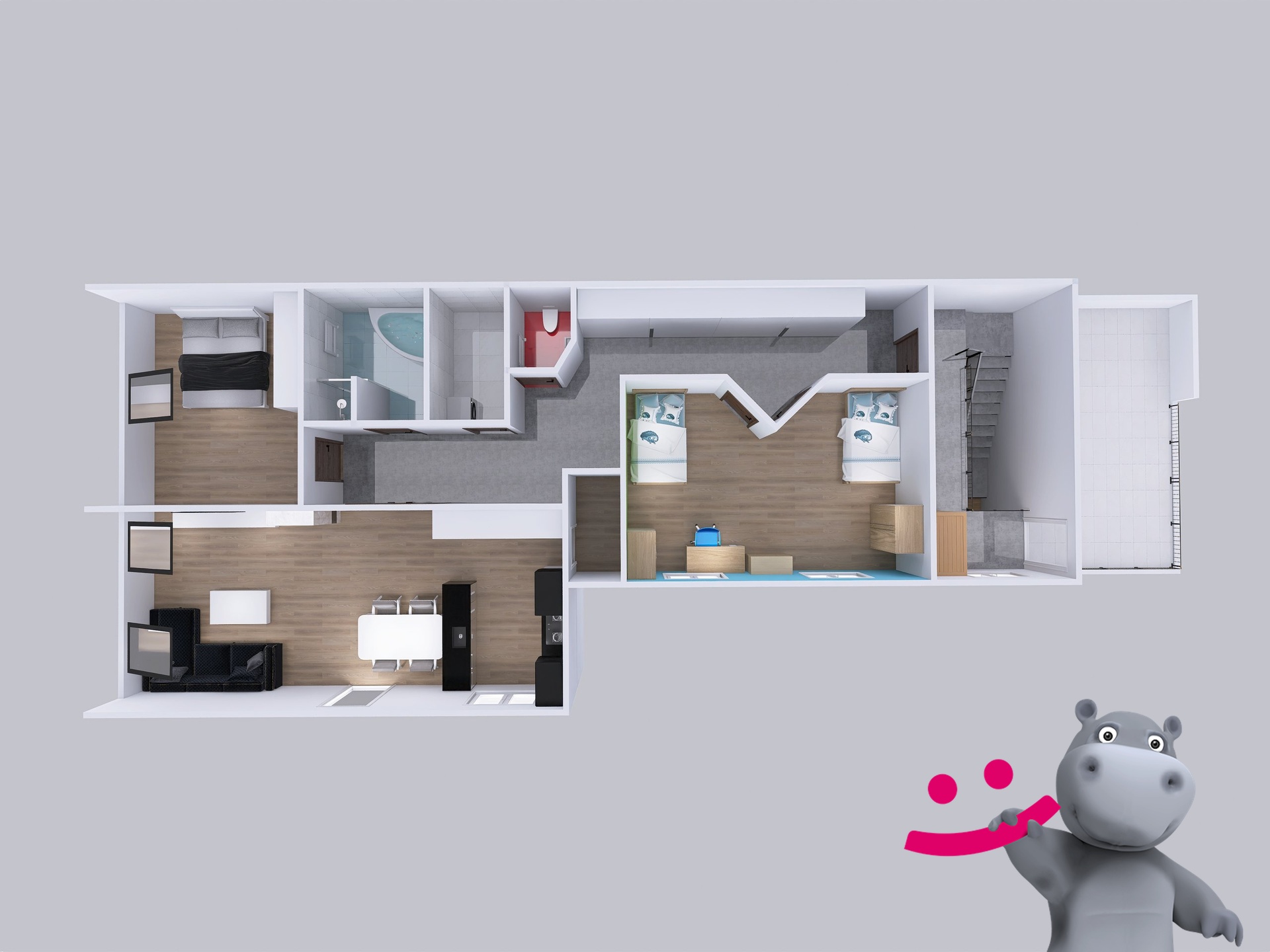 1. BJ 4+1 (96 m2) - po vstupu do bytu je chodba, ze které se jde do každého pokoje zvlášť,
