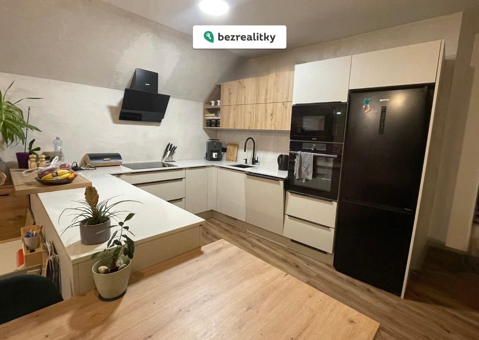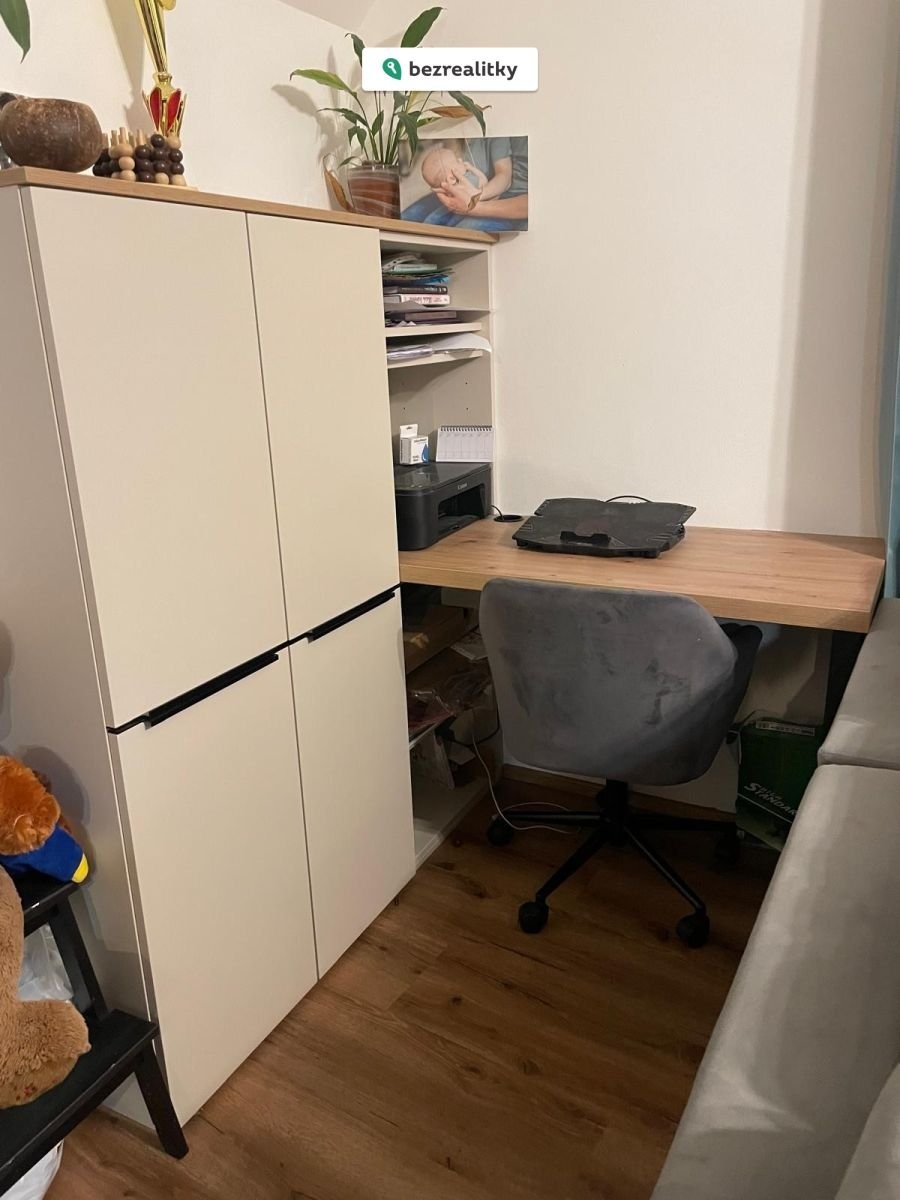 Součástí prodeje je luxusní kuchyňská linka s pracovní deskou Technistone (stejný materiál je i v koupelně a na parapetech), vestavěné skříně, jídelní i pracovní stůl včetně skříní, kompletní obývací stěna a úložné prostory v předsíni i koupelně.