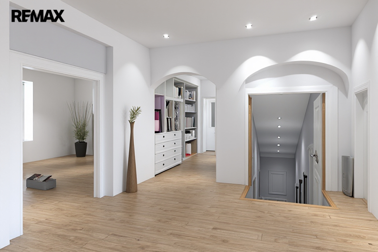2. nadzemním podlaží má užitnou plochu cca dalších 160 m2 a zde by bylo možné mít jeden velikostně nadstandardní byt. Nachází se zde také vstup na balkon a na půdu (dalších cca 142 m²), kde je možné případně dovybudovat půdní vestavbu a rozšířit užitnou plochu domu.