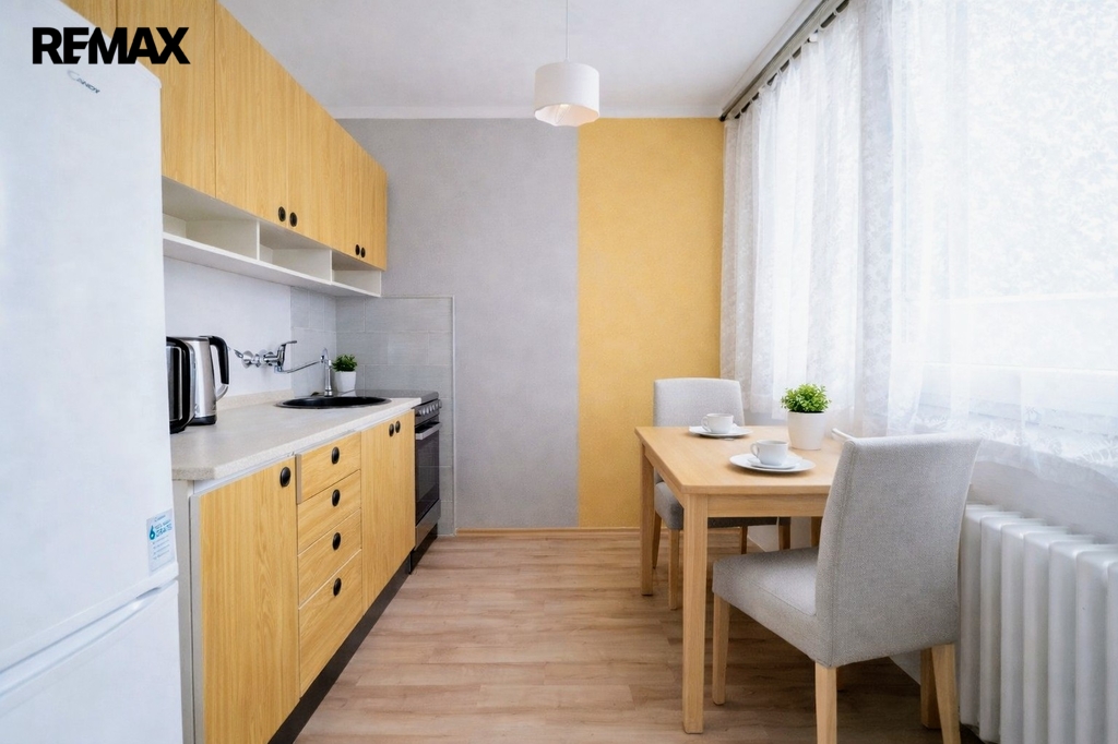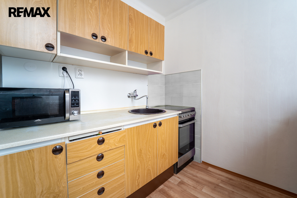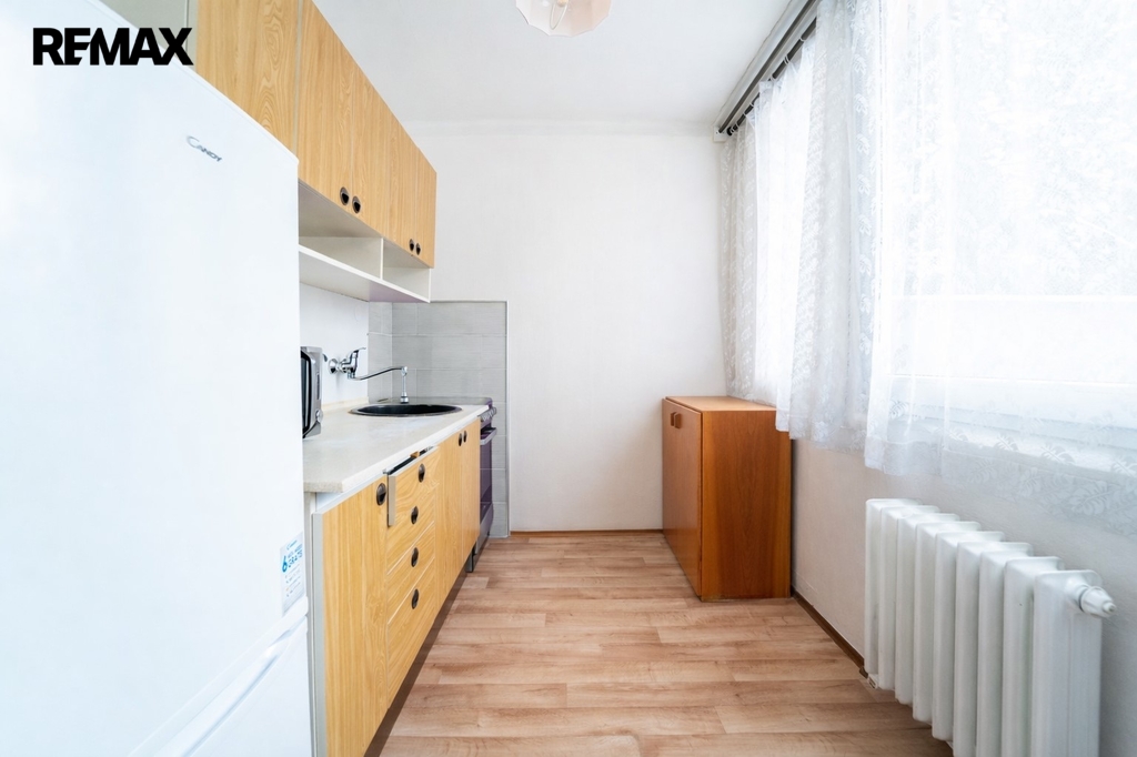 Bytová jednotka 1+1, po rekonstrukci (elektřina, odpady, sociální zařízení), se nachází ve zvýšeném přízemí z 12 pater. Dispoziční řešení: kuchyň, místnost, chodbička s úložným prostorem a koupelna s toaletou. Součástí tržní ceny je kuchyňská linka mimo spotřebičů a vybavení v koupelně s toaletou. Po ploše bytu bylo položeno PVC a dlažba.