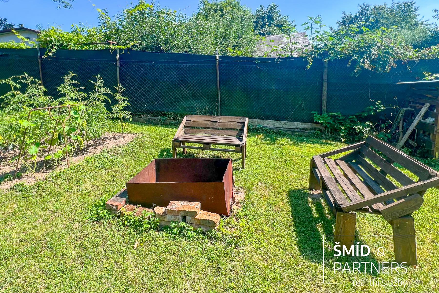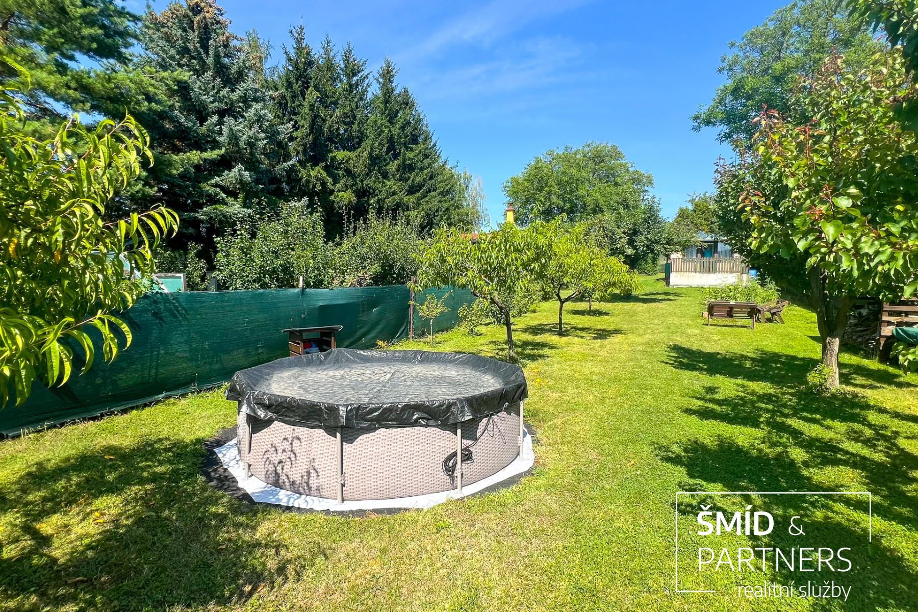 Pozemek je obklopen vzrostlými ovocnými stromy a keři, poskytujícími příjemné stínění a čerstvé plody. Pro děti je připraveno pískoviště a základ pro nadzemní bazén.