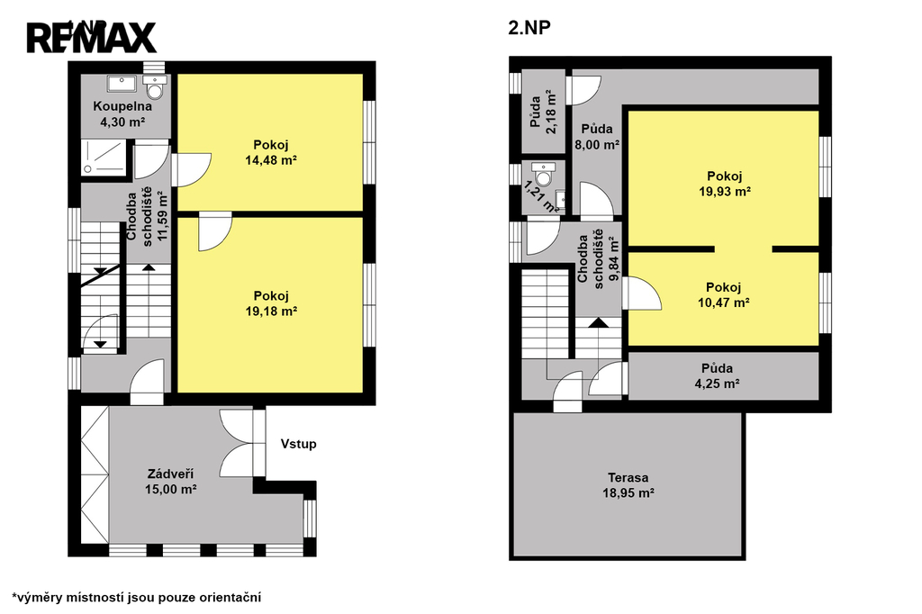 2. NP: dva pokoje a koupelna s WC, vstup z přední části domu přes prostornou chodbu.