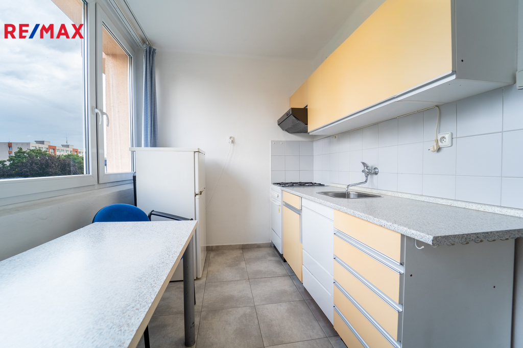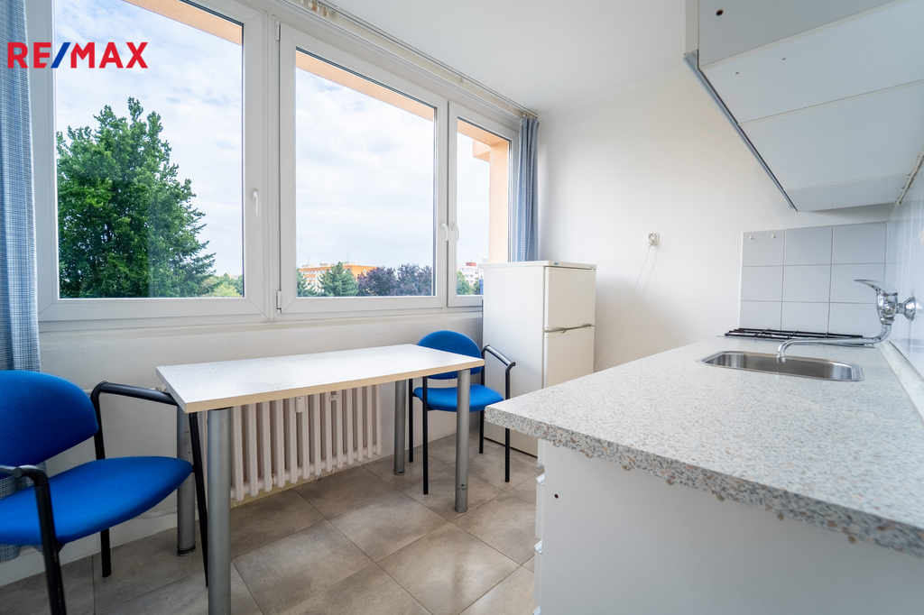 Bytová jednotka 1+1, po rekonstrukci (elektřina, odpady), se nachází ve 4. patře z 12 pater s výhledem do zeleně (školka). Dispoziční řešení: kuchyň s jídelnou, prostorná místnost, chodba s úložným prostorem a koupelna s oddělenou toaletou.