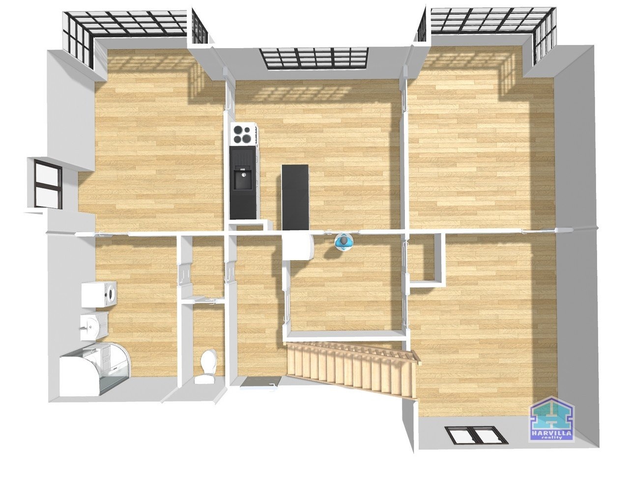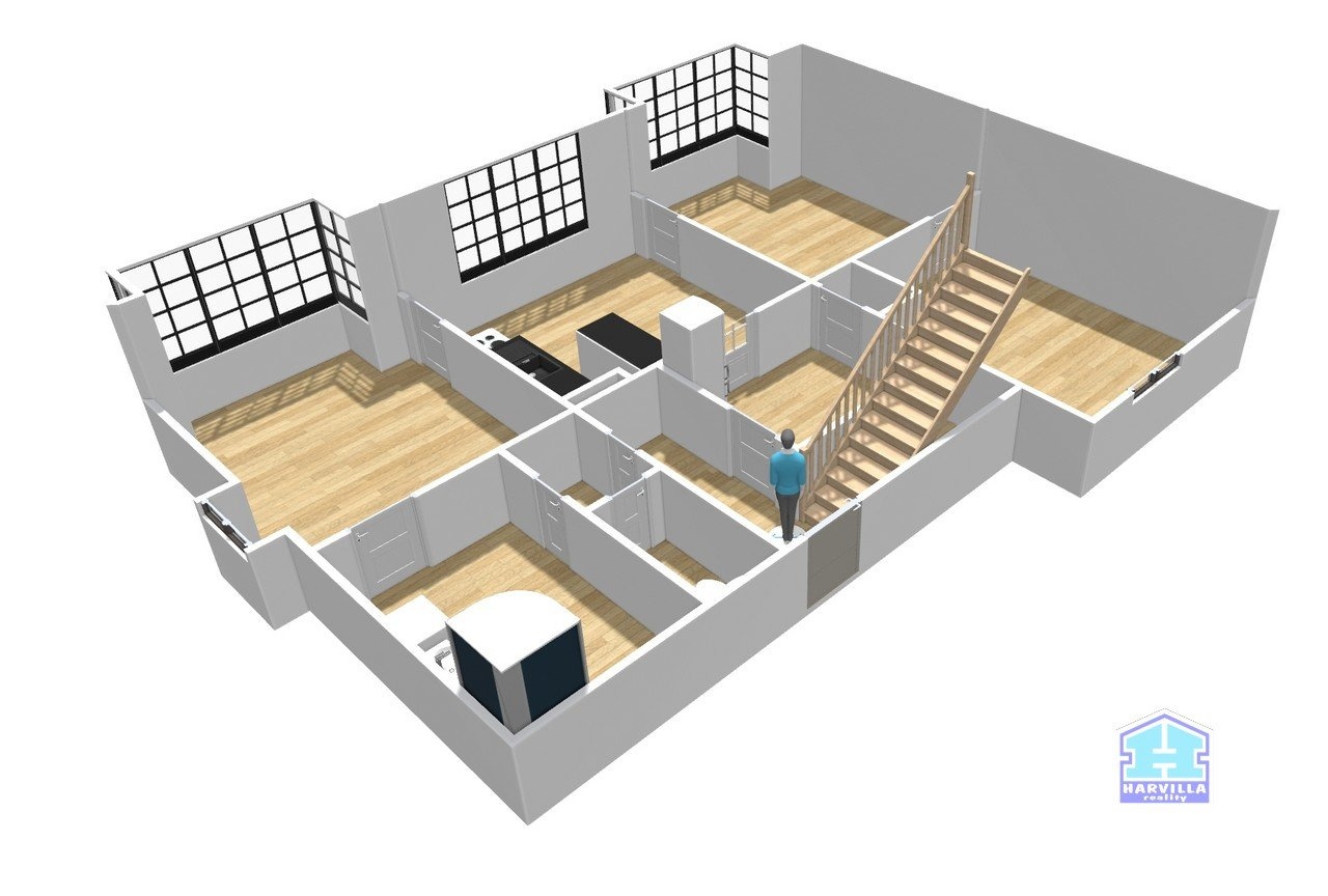 V přízemí je z haly přístup do kuchyně a na WC. Z kuchyně je vstup do obývacího pokoje a z něj dále do ložnice. Z kuchyně se dostaneme i do dětského pokoje, přes který je vstup do koupelny se sprchovým koutem a též na WC.