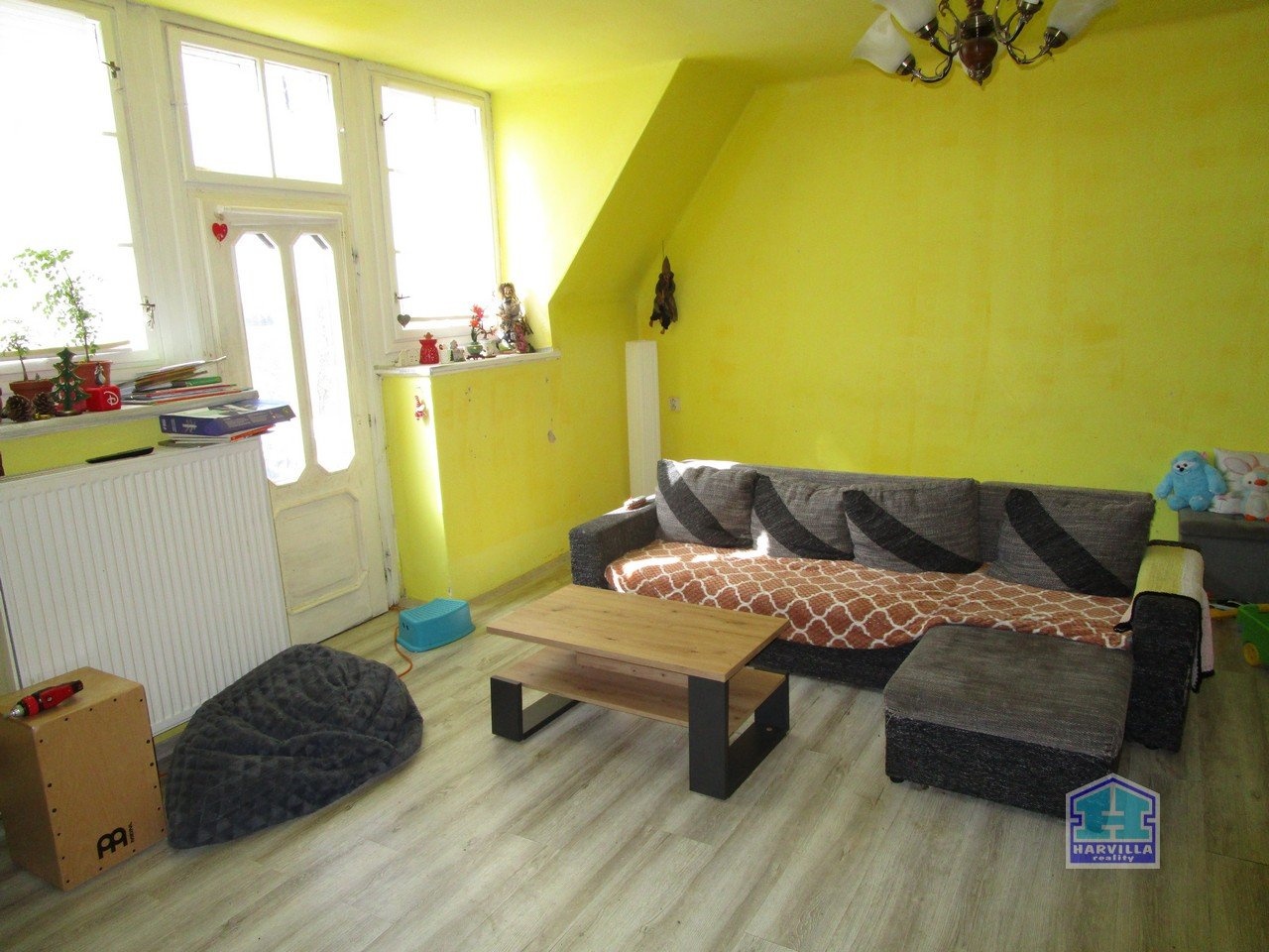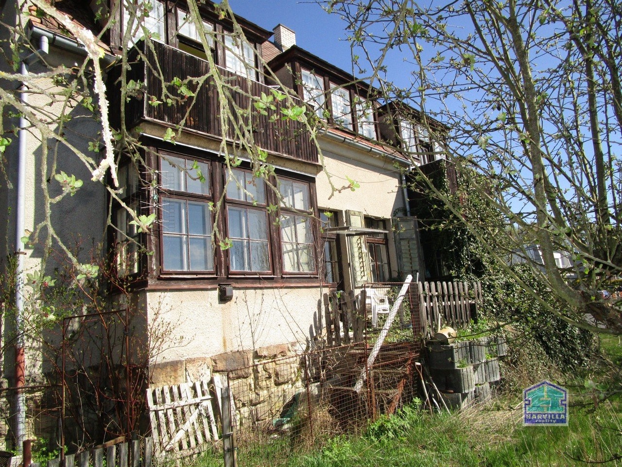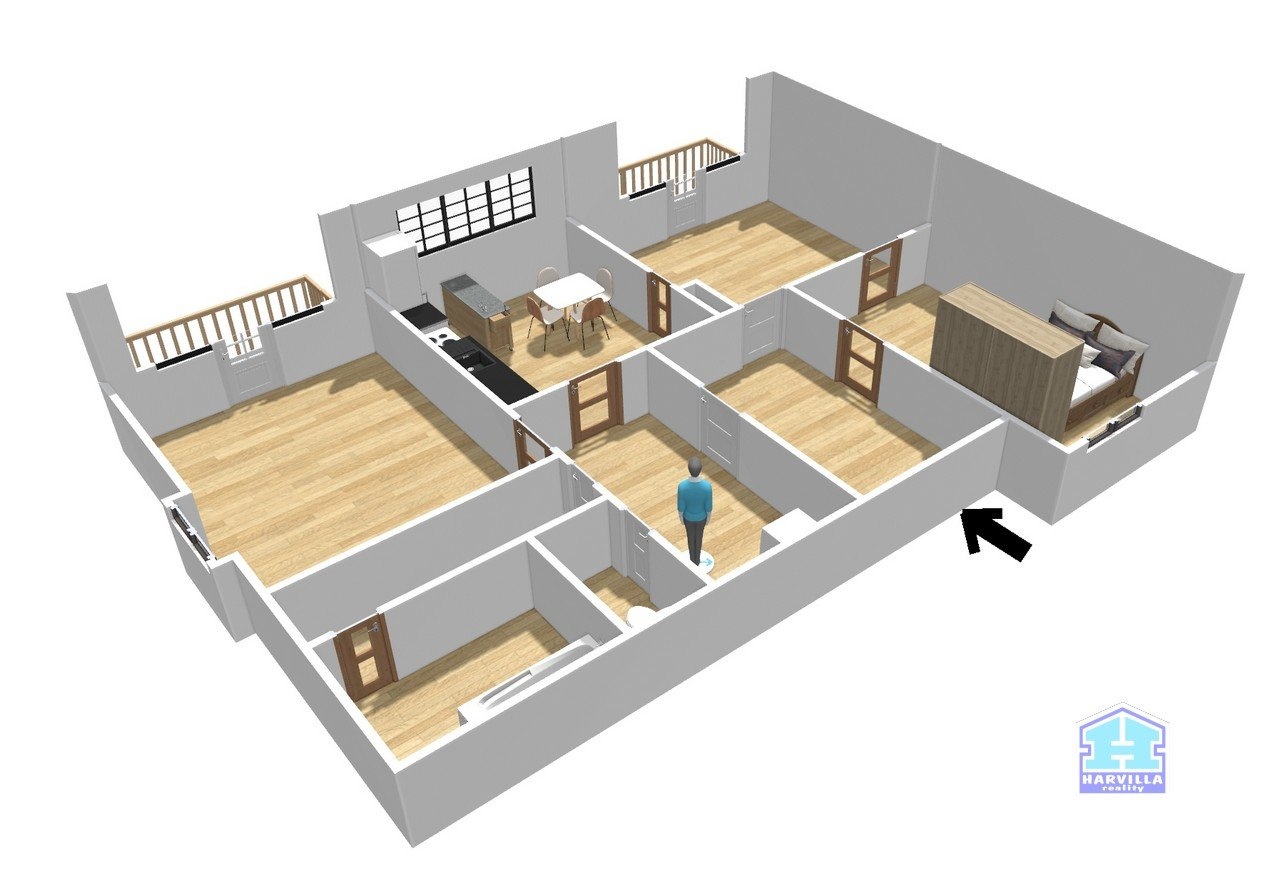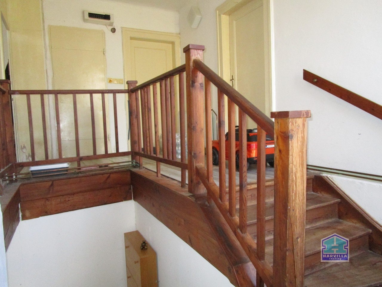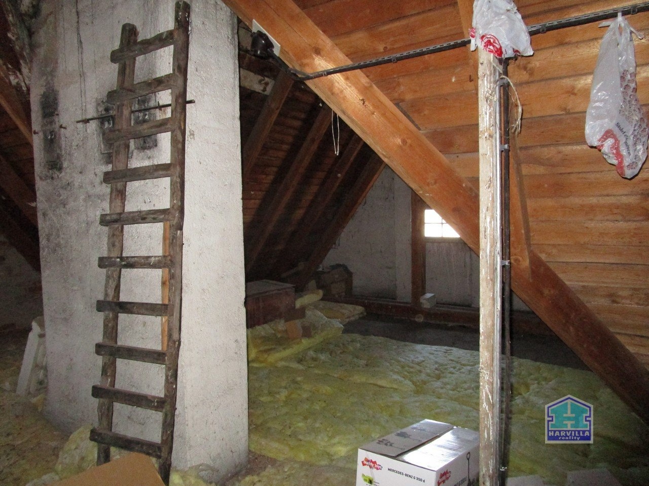 V patře je další byt se vstupní halou, ze které se dostaneme na samostatné WC a do koupelny s vanou, umyvadlem a plynovým kotlem. Z haly je dále vstup do obývacího pokoje s balkonem. Z obývacího pokoje je vstup i do ložnice.