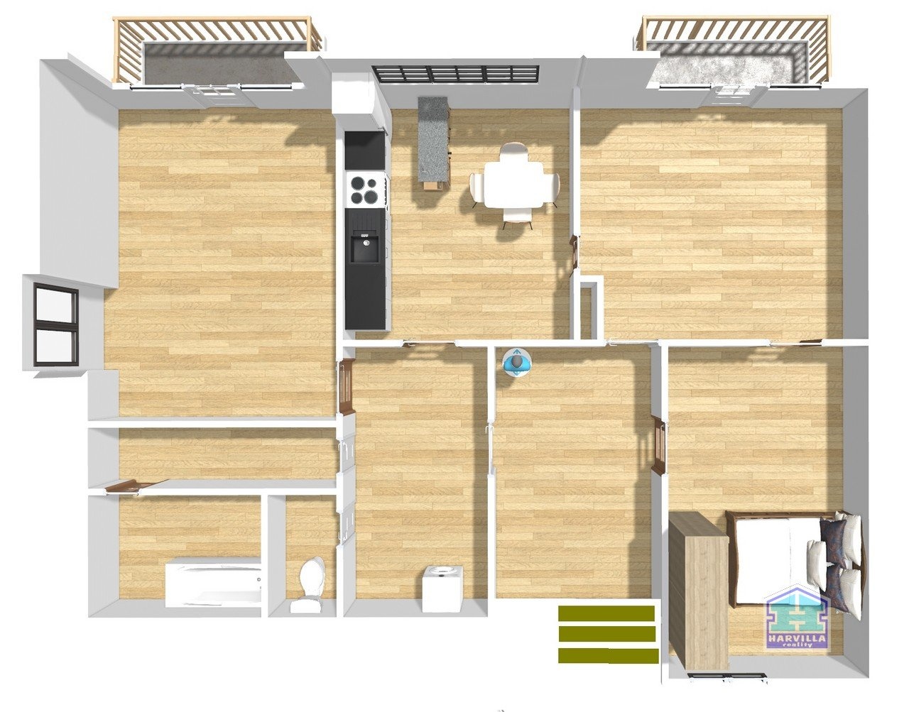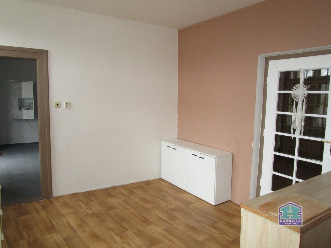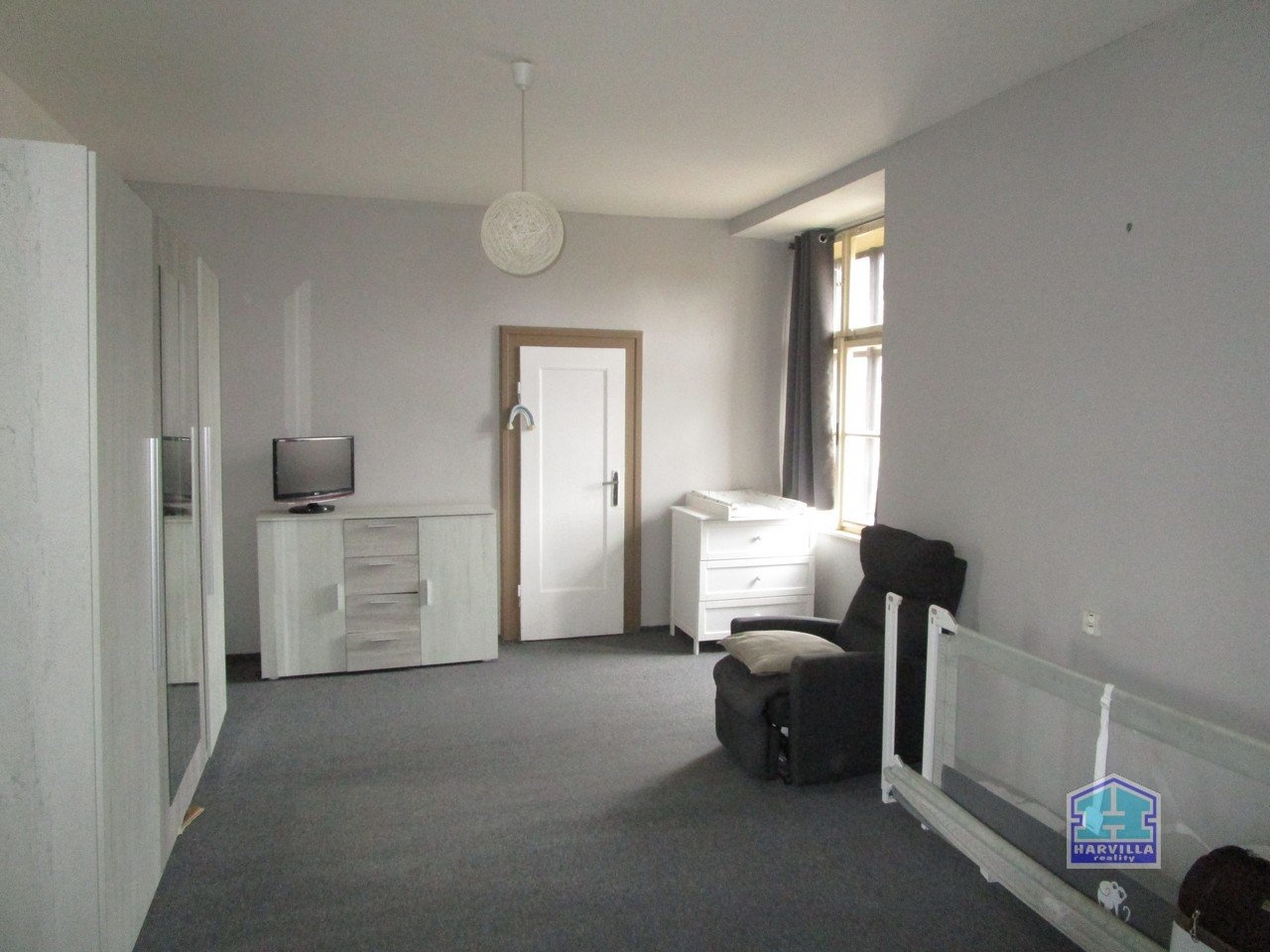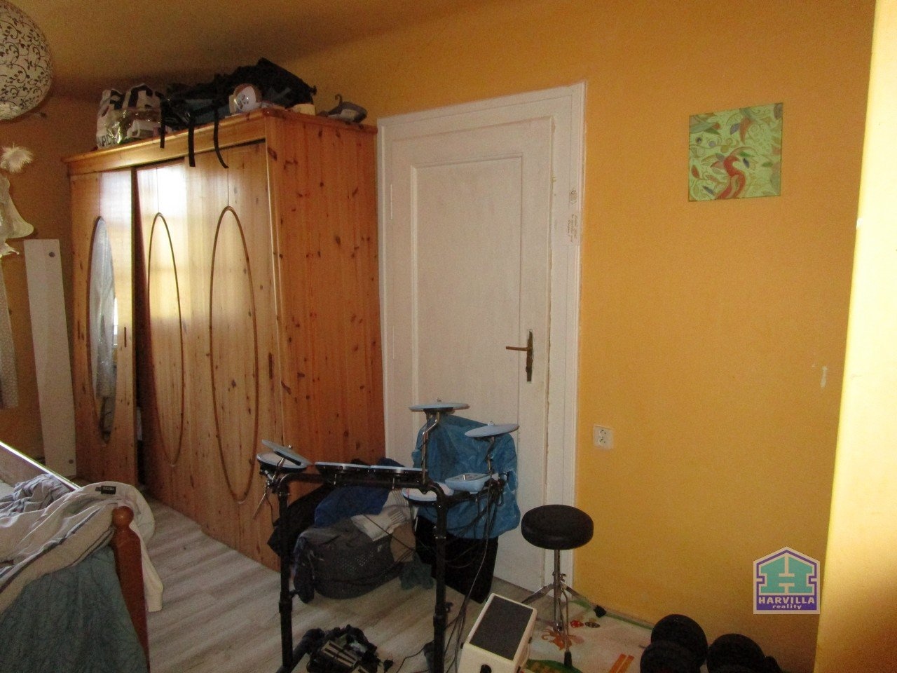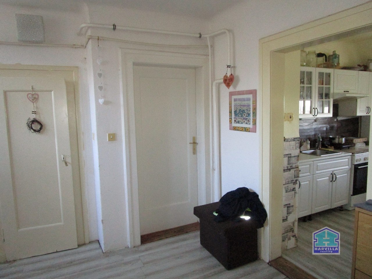 V patře je další byt se vstupní halou, ze které se dostaneme na samostatné WC a do koupelny s vanou, umyvadlem a plynovým kotlem. Z haly je dále vstup do obývacího pokoje s balkonem. Z obývacího pokoje je vstup i do ložnice.