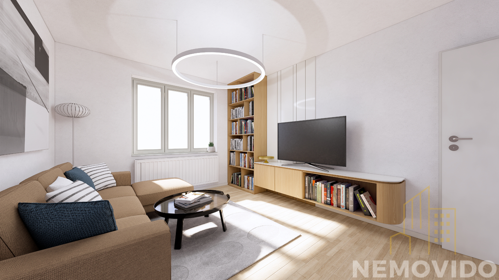 Dominantou bytu je prostorný a světlý obývací pokoj, který poskytuje dostatek místa pro relaxaci i společné chvíle s rodinou.