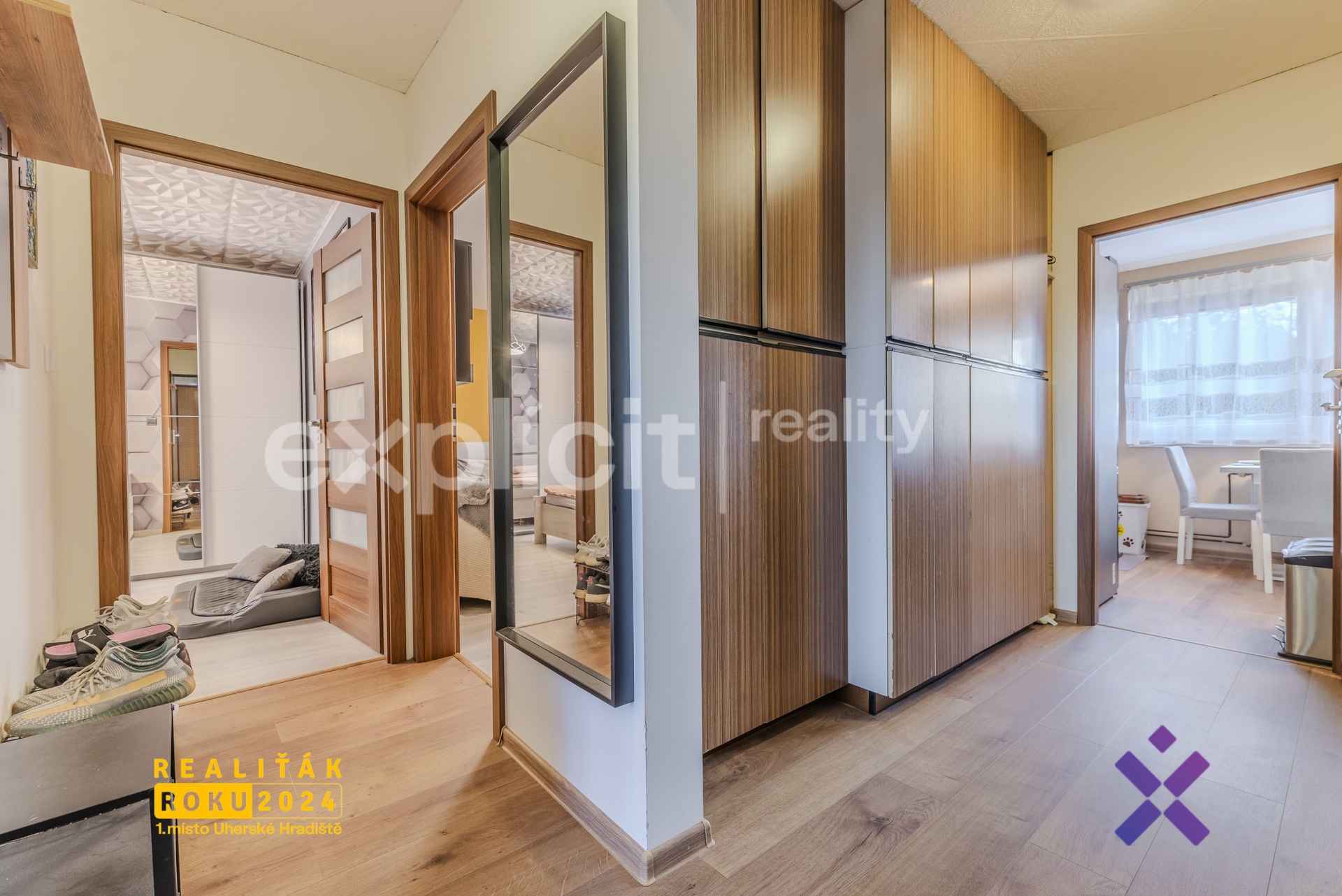 Byt se nachází ve velmi klidné části Koryčan v obci Lískovec, kde najdete nejen příjemnou komunitu sousedů (většinou dospělé rodiny a starší manželé), ale také dobré dopravní spojení, dětské hřiště a tenisový klub. Veškerá občanská vybavenost je dostupná přímo v Koryčanech. Obývací pokoj a kuchyně jsou orientovány na jih, což zajišťuje dostatek světla po většinu dne.