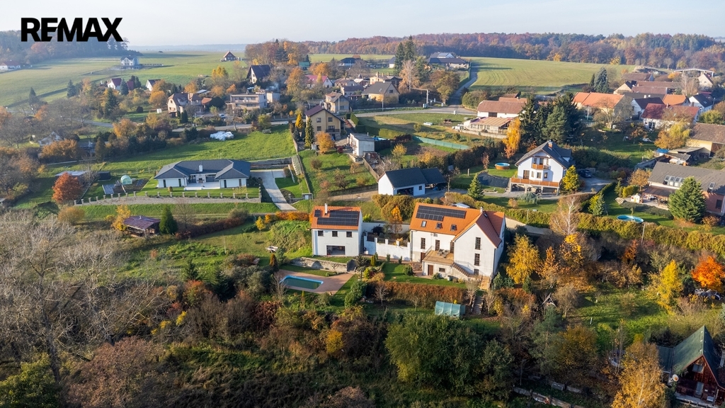 Součástí domu je velká terasa s nádherným výhledem, bazén a vedlejší stavba – v přízemí budoucí venkovní posezení s krbem, v patře prostorná garáž. Vytápění zajišťuje kotel na pelety, ohřev vody elektrický bojler, na střeše jsou solární panely s bateriovým úložištěm (2 roky staré). Dům má eurookna, alarm a v podkroví klimatizaci. Přístup je zajištěn z obecní komunikace.