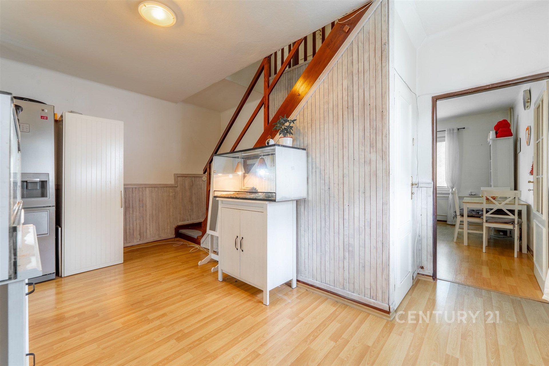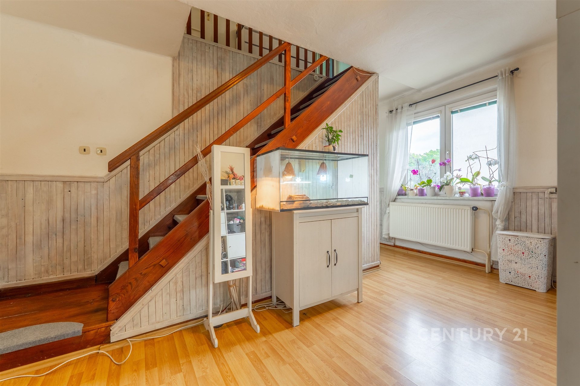 Přízemí: do domu vstoupíme zadní částí domu přes verandu do malé předsíně, kde se nachází WC s umyvadlem, dále pak jídelna, malá kuchyňka a obývací pokoj. Po schodech vejdeme do prvního patra. Zde je umístěna ložnice, koupelna a prostorný dětský pokoj.