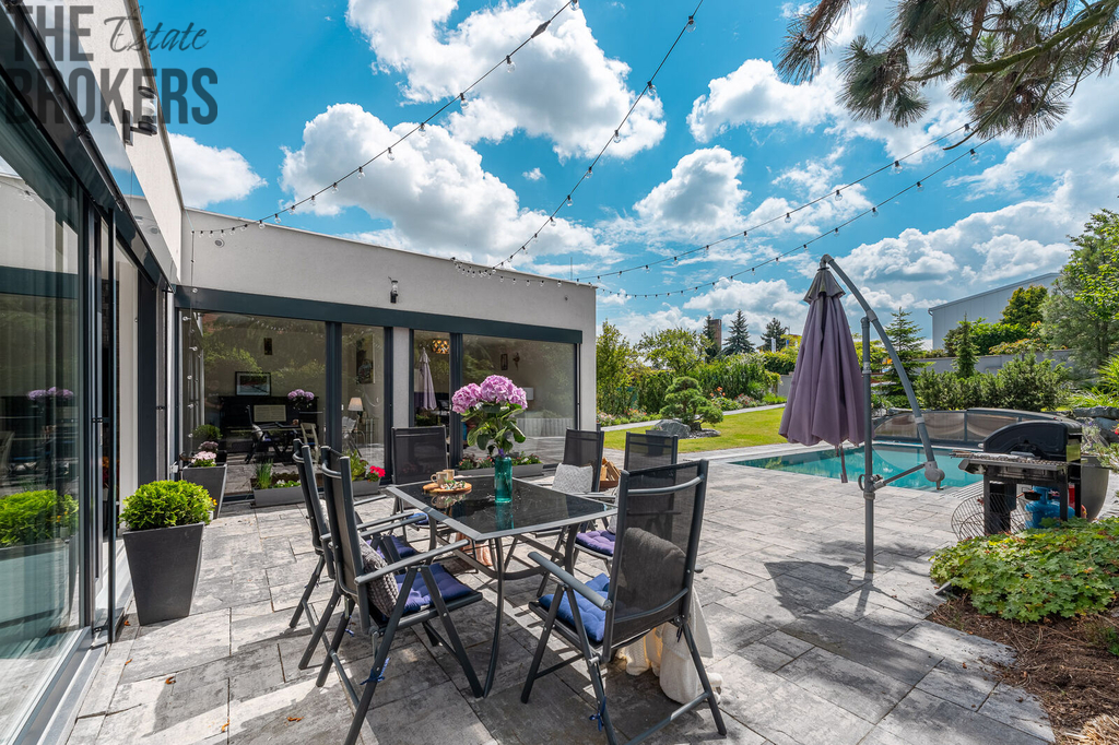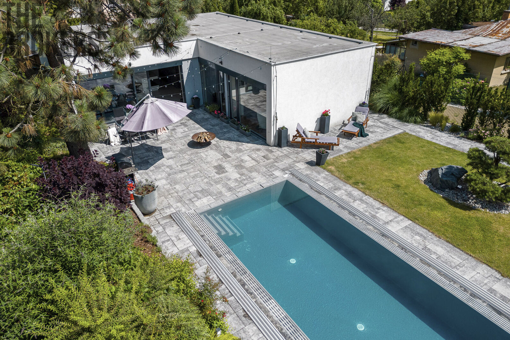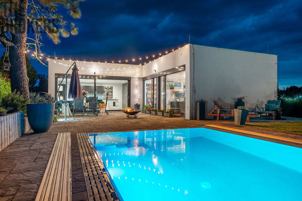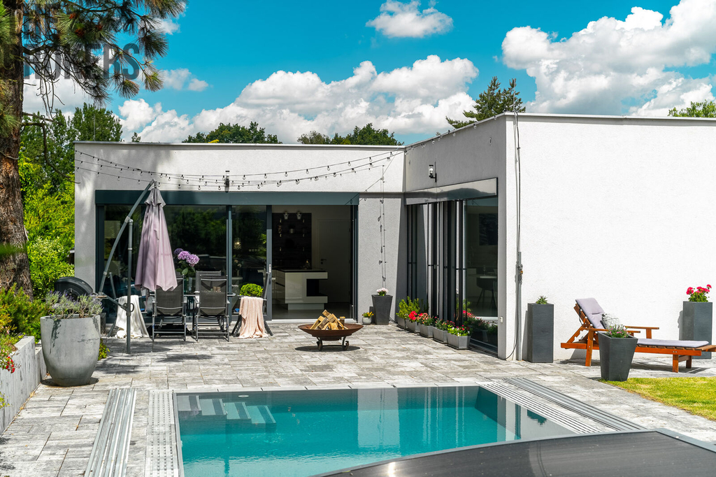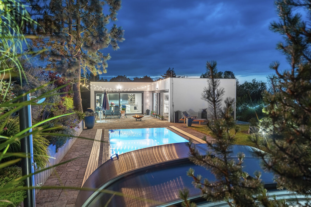Na zahradě naleznete přelivový bazén, kde voda je na úrovni terasy. Bazén je vyhřívaný tepelným čerpadlem, má šedou folii, protiproud a osvětlovací systém, který umožňuje všechny barvy osvětlení. Relaxaci a odpočinek zajistí také zahradní domek s vířivkou.