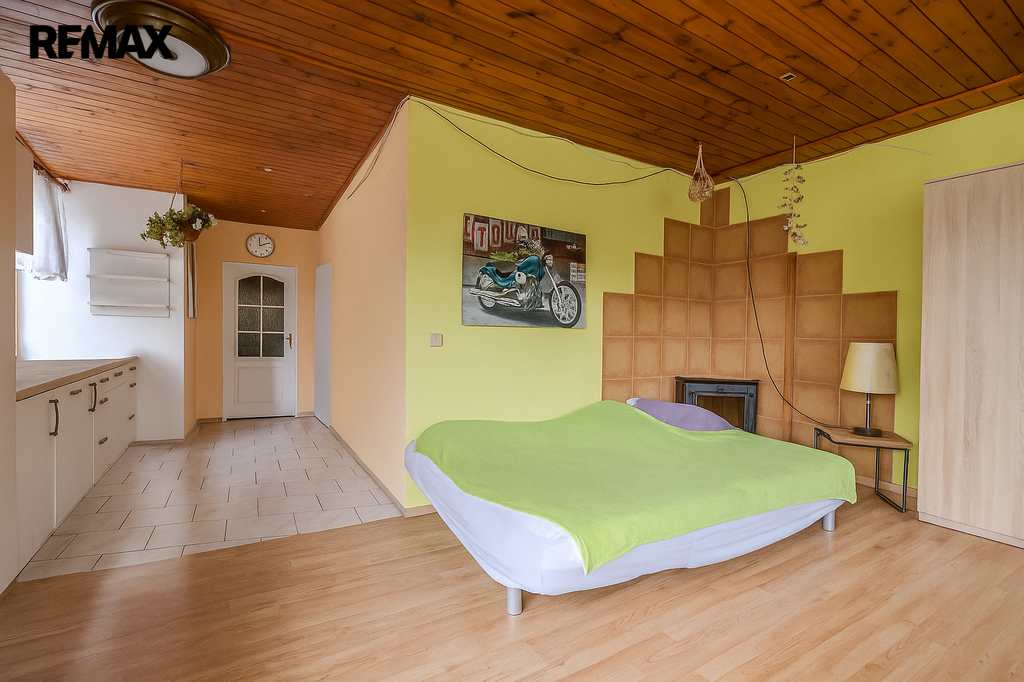 Některé fotografie jsou prezentovány s využitím AI home staiging, a to bez nábytku a osobních věcí, část prostor v 1.NP, průjezd domu, dílna.