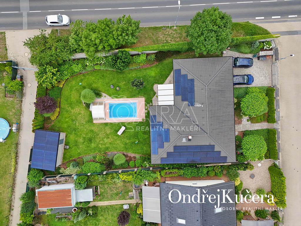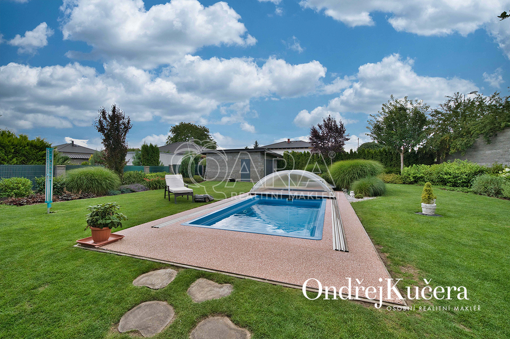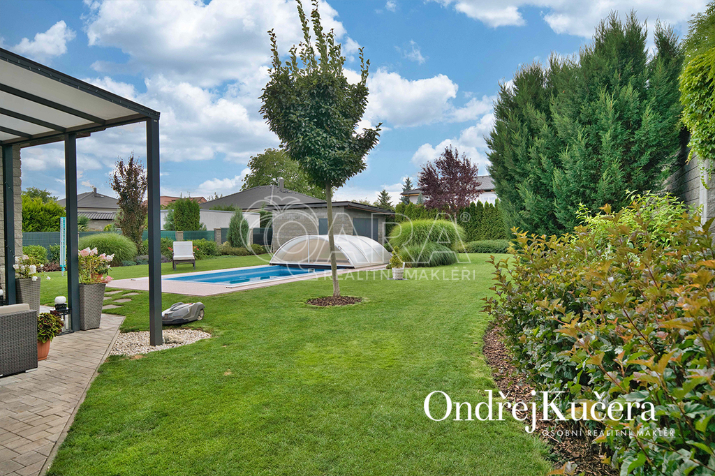 Zahrada kolem domu byla promyšleně navržena architektem, aby se během roku měnila v pestrou podívanou. Automatický zavlažovací systém napojený na vlastní vrt a retenční nádrž zajišťuje její nenáročnou údržbu. Je zde také zapuštěný keramický bazén se slanou vodou a samostatný zahradní domek s dílnou. Součástí prodeje je i automatická sekačka.