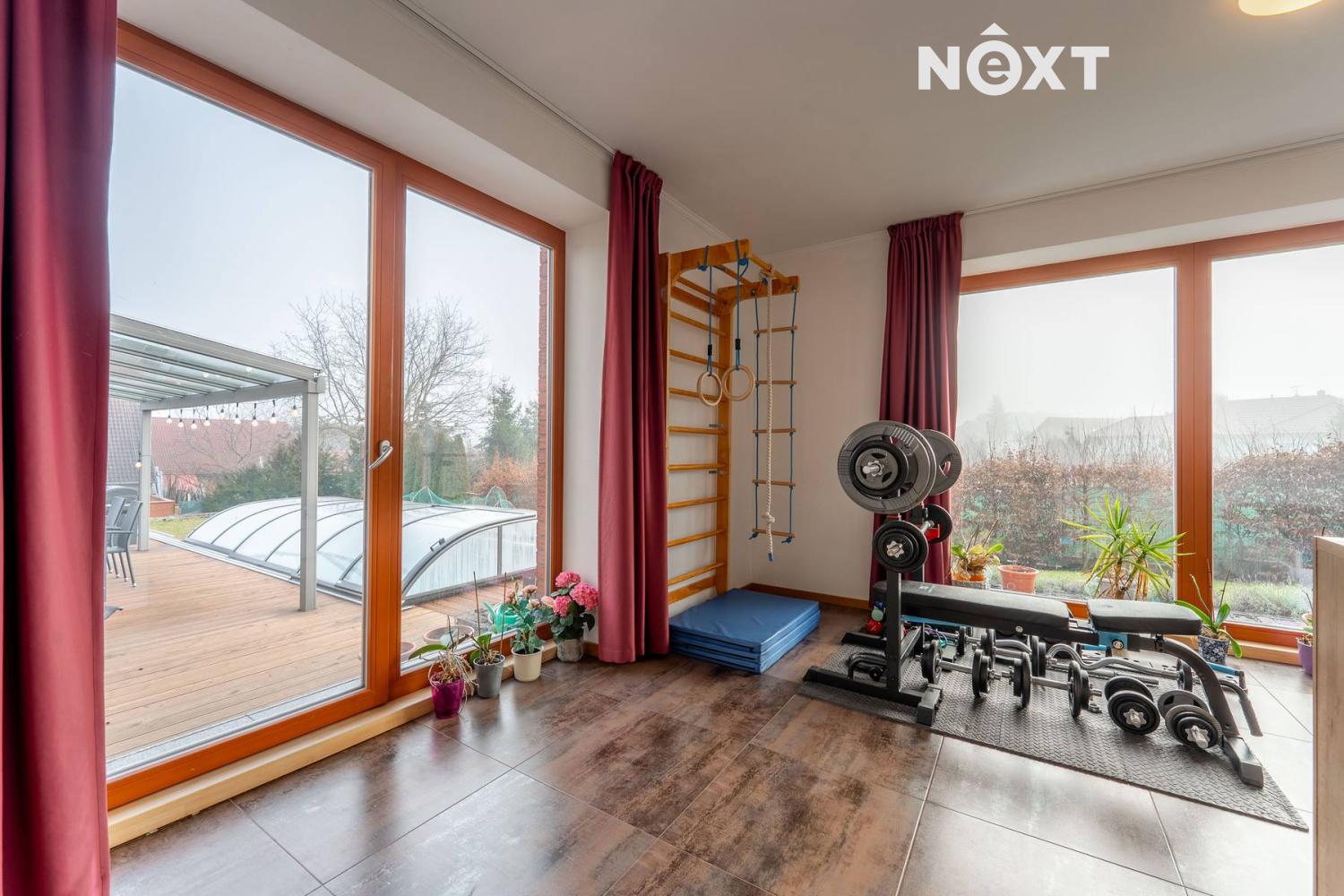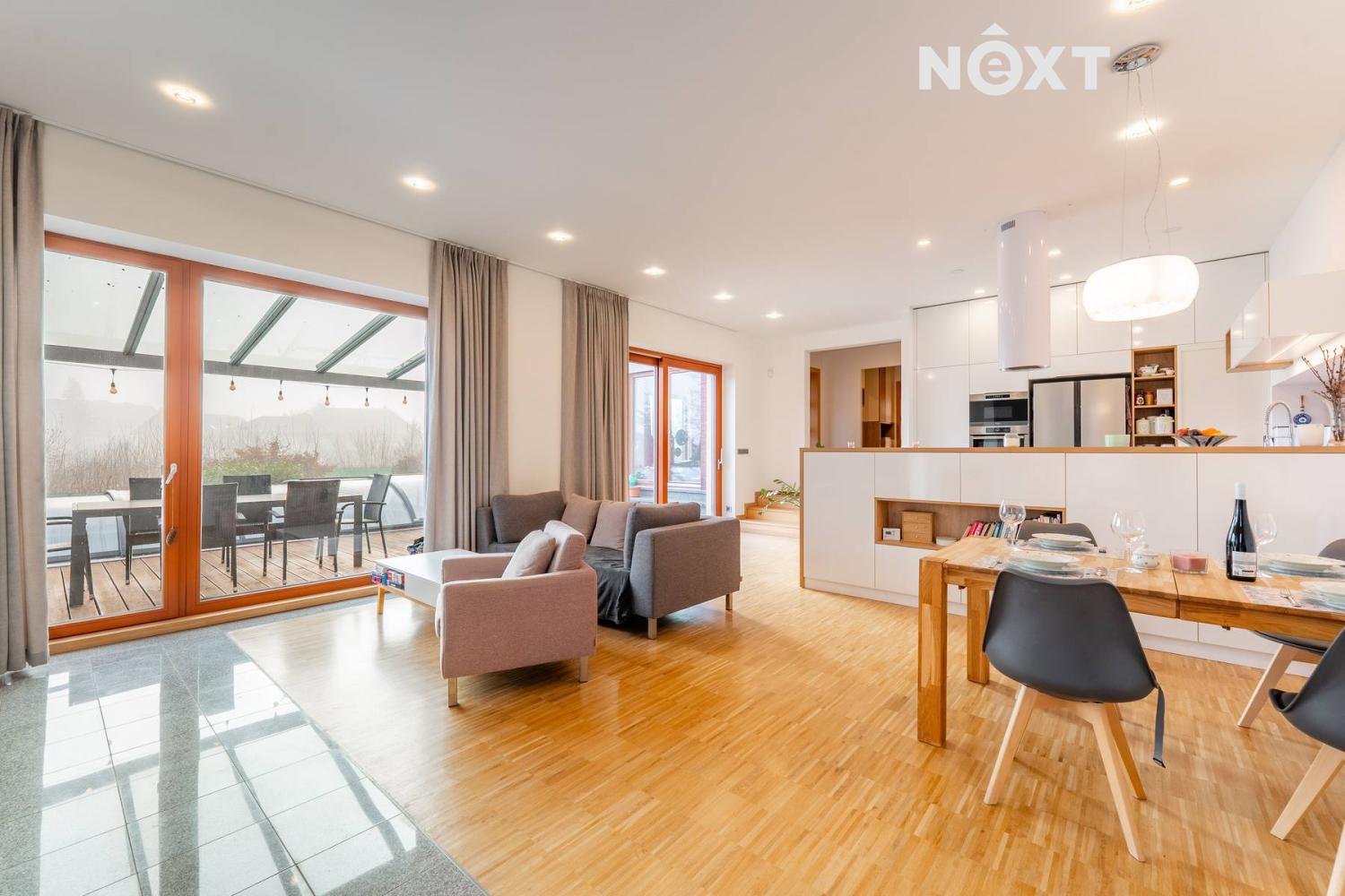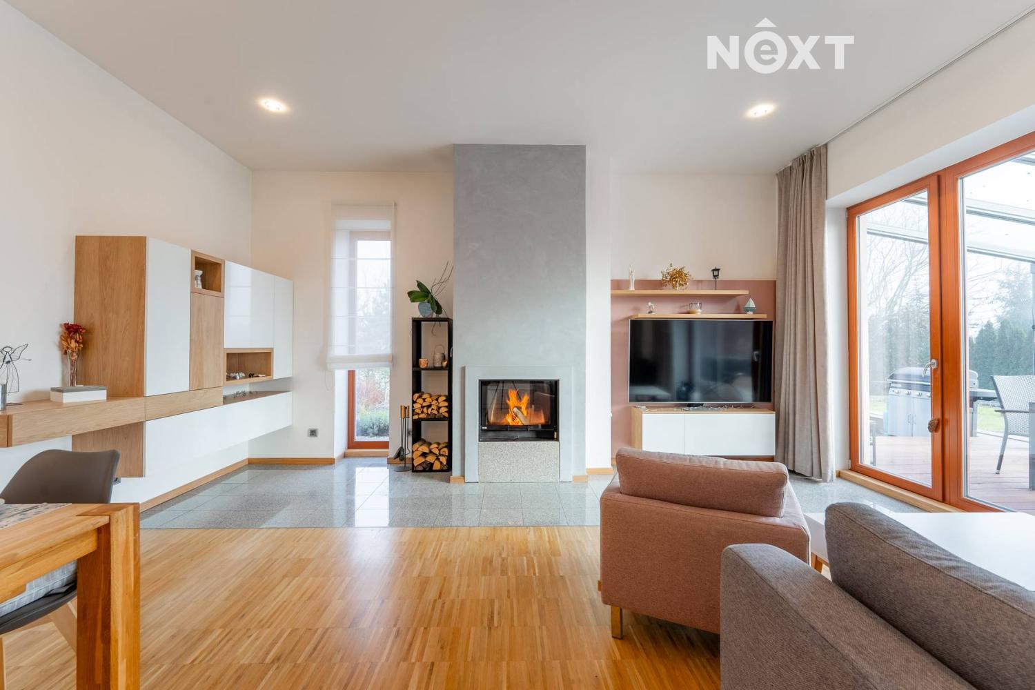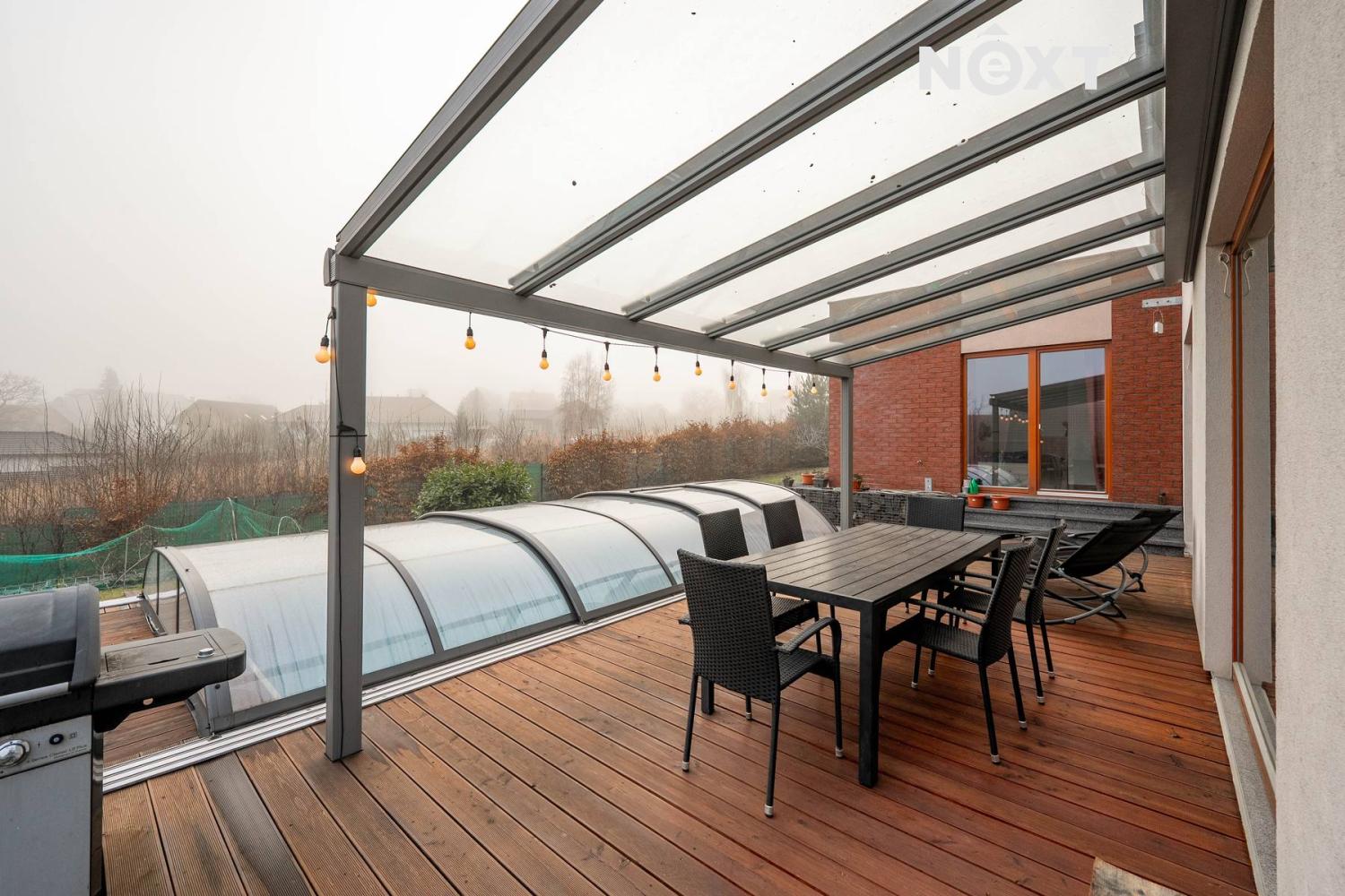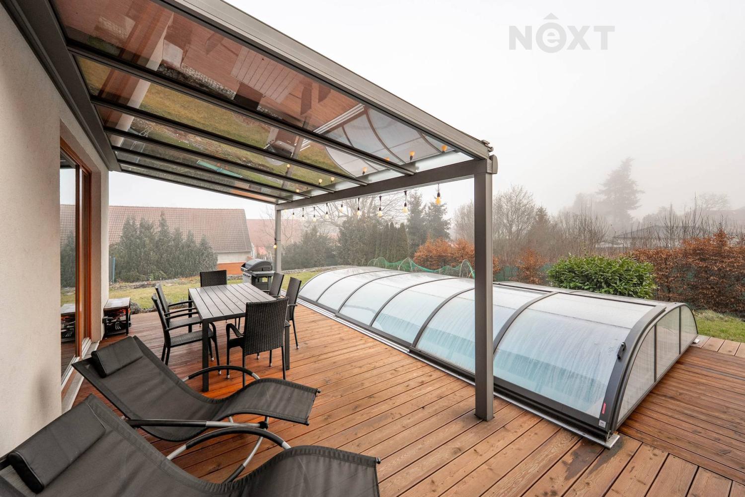Dominantou domu je prostorný obývací pokoj propojený s kuchyní a jídelnou, odkud je přímý vstup na terasu o velikosti 30 m². Terasa je zastřešená a vybavená automatickým stíněním, díky čemuž nabízí ideální místo pro posezení po celý den i za každého počasí. Příjemnou atmosféru interiéru dotváří krb, který dodává domovu teplo a útulnost v chladnějších měsících. Na obytnou část plynule navazuje zahrada, jejíž přirozenou dominantou je venkovní bazén o rozměrech 6 × 3 metry s moderní technologií na slanou vodu a zastřešením, umožňujícím prodloužení koupací sezóny.