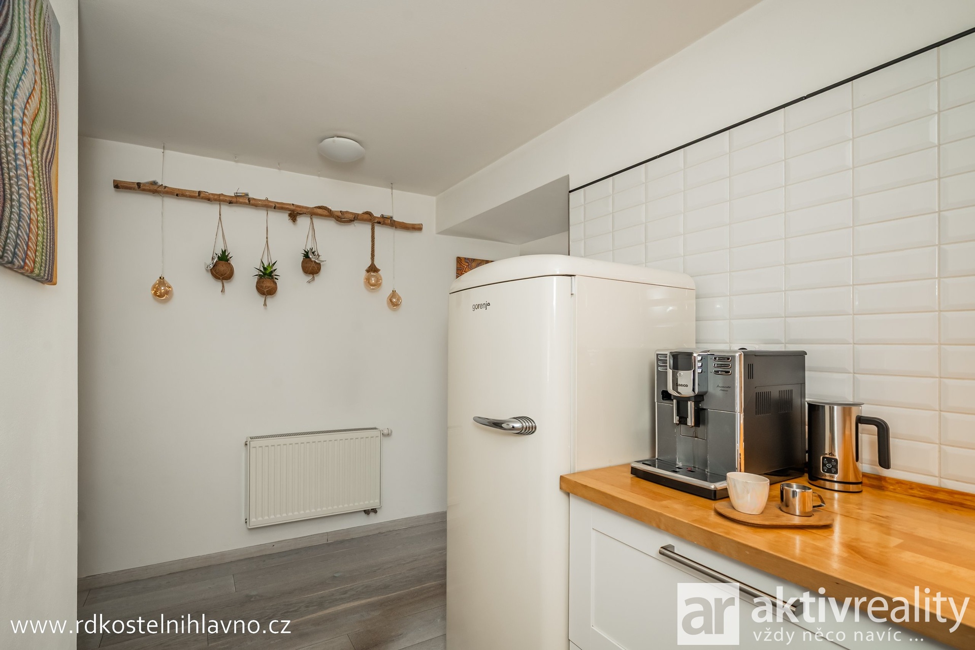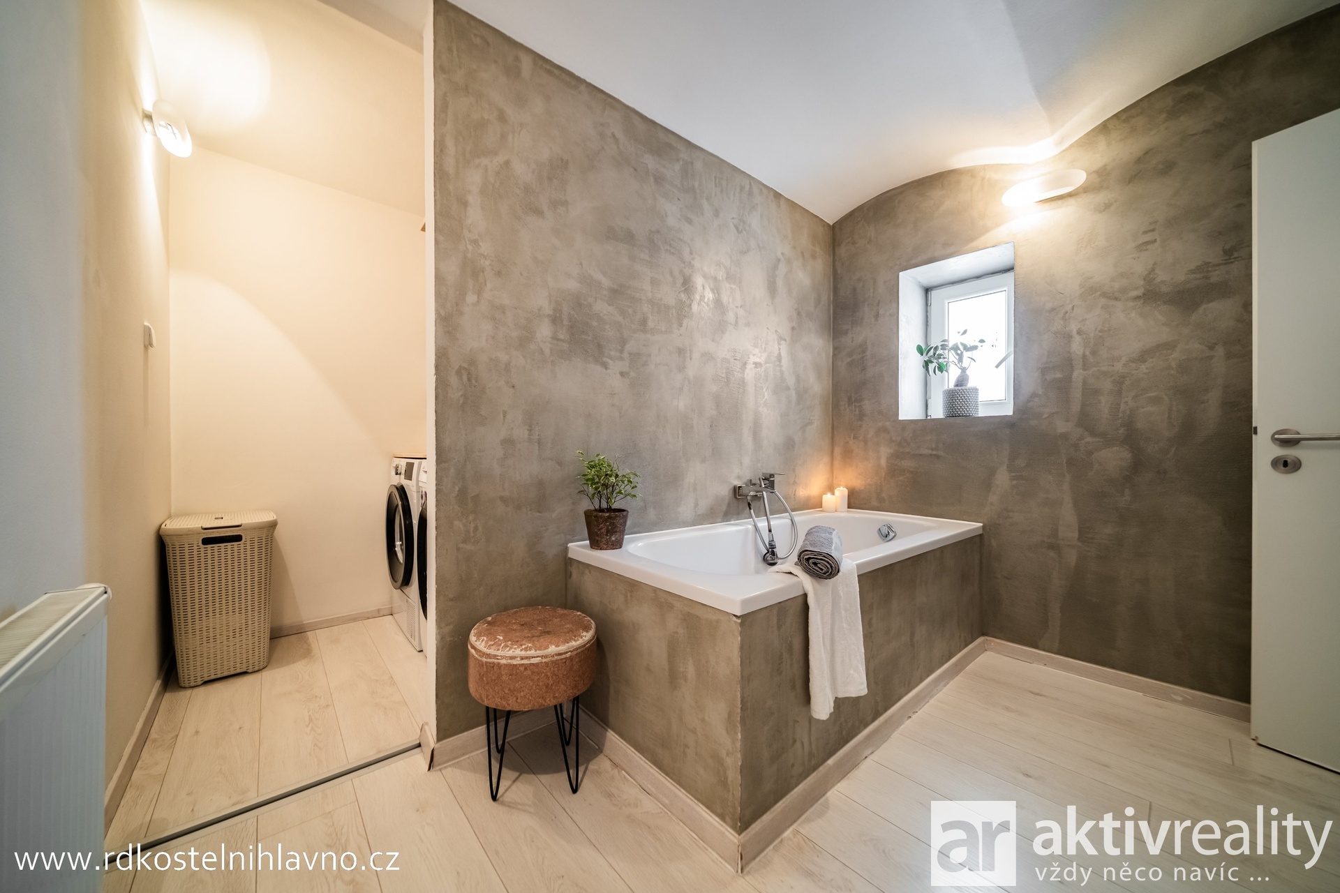 V přízemí vás přivítá světlá a prostorná vstupní chodba se skrytou šatnou, která nabízí dostatek úložného prostoru. Z chodby se dostanete do hlavní obytné části – kuchyně, která je vybavena vestavěnými spotřebiči a prakticky oddělena od obývacího pokoje komínem s krbem. Dále je zde ložnice a další pokoj, který lze využít například jako dětský nebo pracovní. Koupelna je laděná do moderního stylu, s designovou betonovou stěrkou, která je téměř bezúdržbová, a vedle ní se nachází samostatná toaleta.
