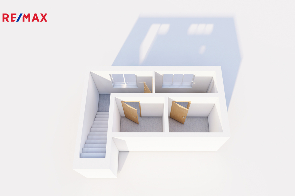 Do bytu se vstupuje z přízemí, kde je zádveří, chodba a dvě komory, které poslouží jako praktické sklady nebo úložné prostory. Odtud vede schodiště do hlavní obytné části, která se nachází v patře. V obytném podlaží najdete kuchyni (10 m²), obývací pokoj (17 m²), ložnici (15 m²), koupelnu s vanou (5,8 m²) a samostatné WC. Součástí je také prostorná předsíň (7,6 m²) a chodba. Nad vstupní částí do bytu se nachází půdní prostor o velikosti 14 m², který je ve velmi dobrém stavu a nabízí další možnosti využití – ať už jako úložný prostor, nebo třeba k vestavbě.