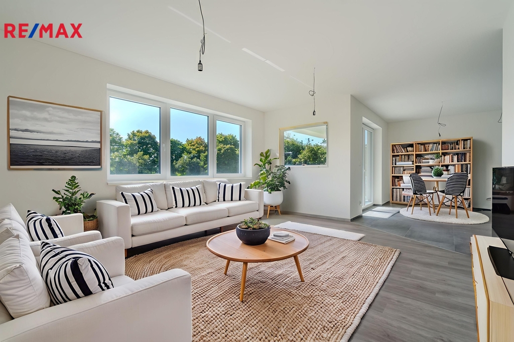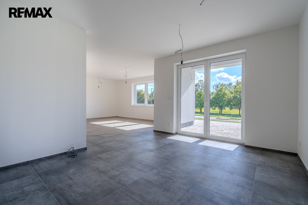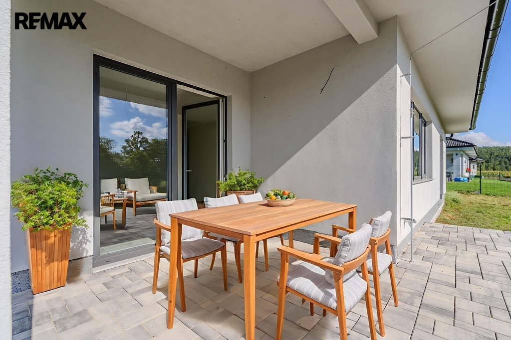 Dům má velmi krásný prostor pro obývací pokoj spojený s jídelnou a kuchyní. Velká okna na jih, z jídelny je východ přímo na terasu 36,53m2.