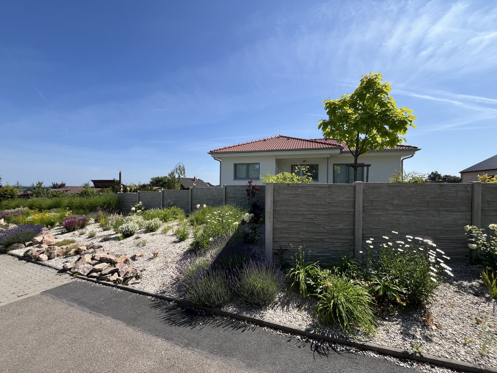 Příjezdová komunikace i chodníky provedeny ve finální zámkové dlažbě, s veřejným osvětlením ulice. Pozemek je kompletně oplocen. Ve směru k ulici z betonových plotových prefabrikátů (stavebnice sloupek + výplň), branka a brána z hliníkových profilů a plot mezi sousedním pozemkem v systému pletiva a ocelových sloupků s plastovou povrchovou úpravou v zelené barvě.