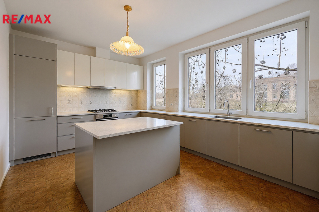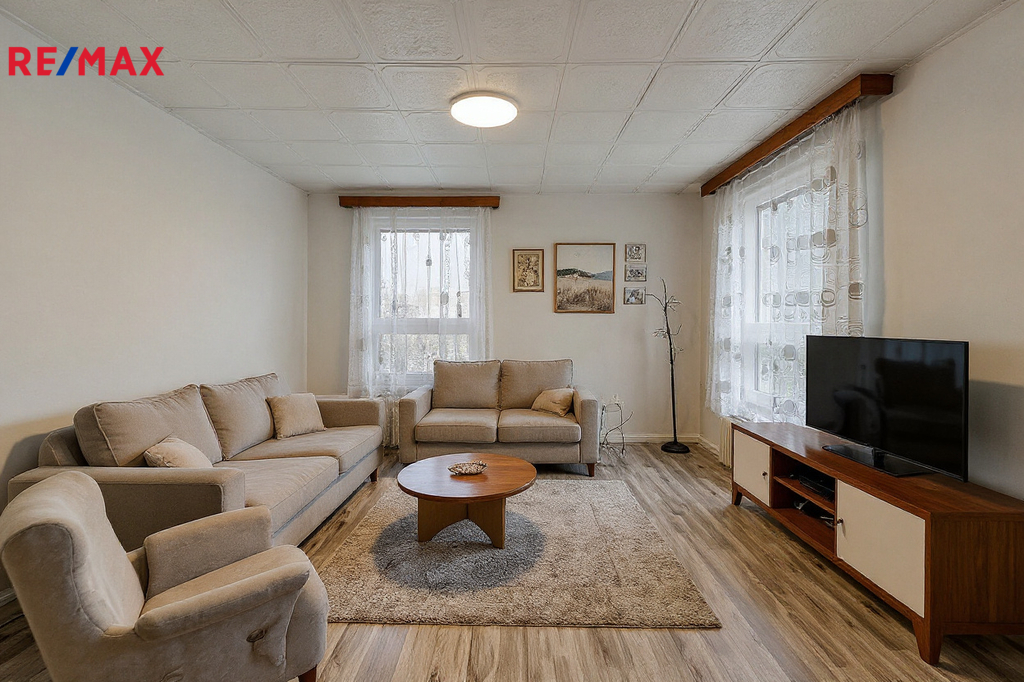 Obytné podlaží se skládá z obývacího pokoje, kuchyně, tří pokojů, koupelny, toalety a chodby. Dům má ze dvou stran balkón. Aktuálně je byt vytápěn pomocí plynového kotle s rozvodem do radiátoru, ohřev vody el. boilerem. Krb v obývacím pokoji. Dům má částečně vyměněna okna za plastová. Náklady na provoz bytu včetně fondu oprav činí zhruba 5 400,-Kč/měsíc + individuální spotřeba elektřiny a plynu v bytě.