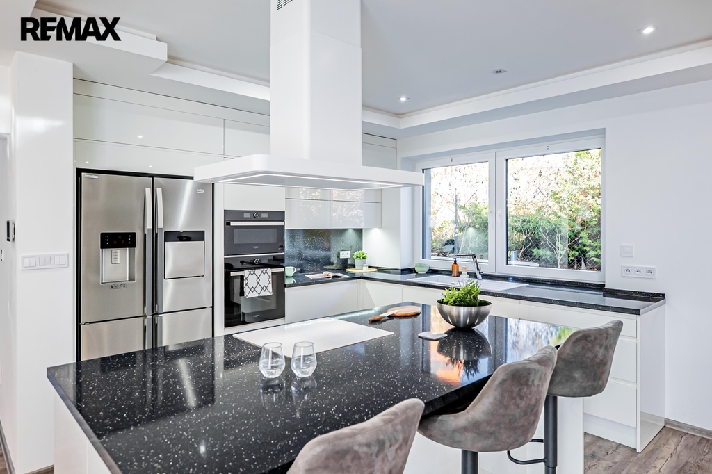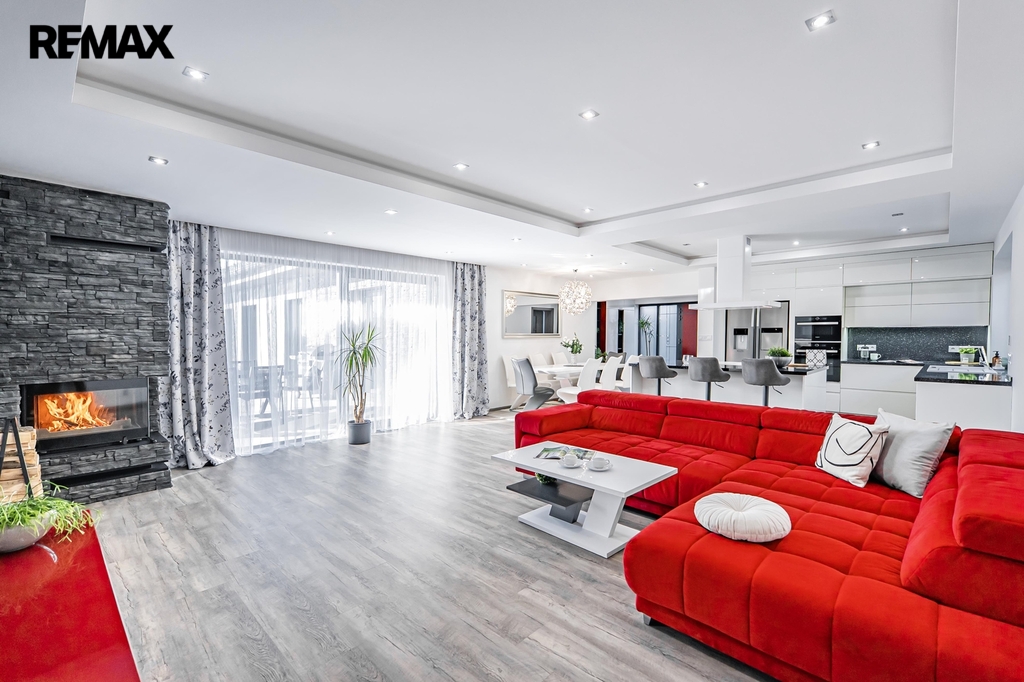 Dominantou domu je velmi prostorná místnost s přímým vstupem na terasu, která je rozdělena na obývací část s krbem a kuchyňskou a jídelní část vybavenou moderní kuchyňskou linkou se zabudovanými spotřebiči včetně myčky a americké lednice. Najdete zde tedy velký otevřený prostor ideální pro posezení s rodinou či přáteli. K pohodlí přispějí dvě koupelny a samostatná toaleta.