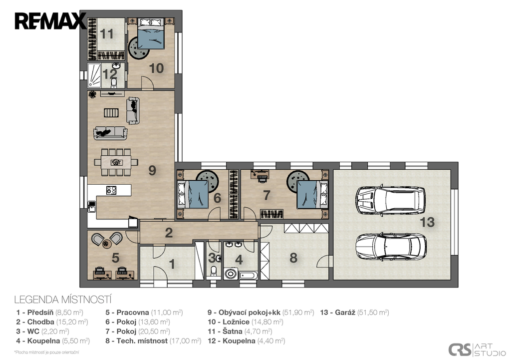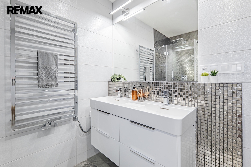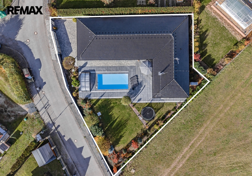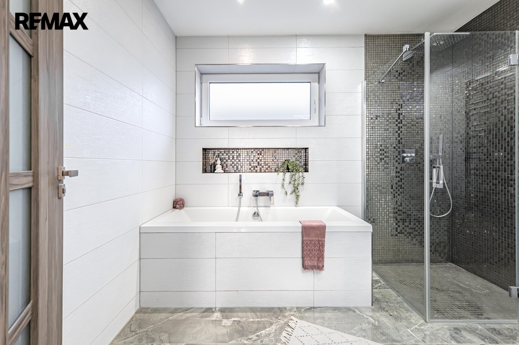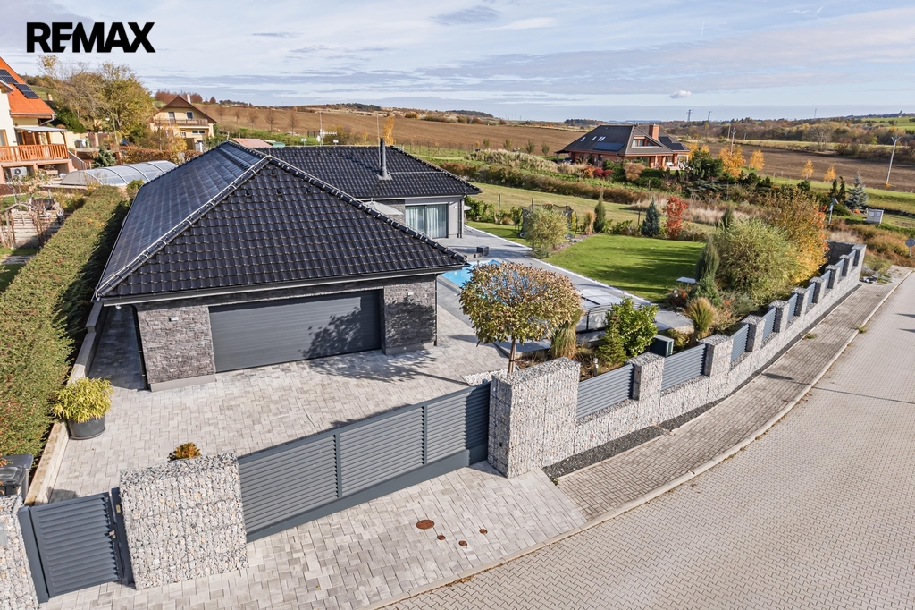 K domu náleží zahrada s okrasnými keři, vybavena závlahovým systémem a retenční nádrží pro efektivní hospodaření s vodou. Pohodlí při parkování zajistí dvojgaráž a venkovní stání, vjezd na pozemek je zajištěn automatickými vraty. Dům je zabezpečen kamerovým systémem a je připraven na instalaci alarmu a centrálního vysavače.