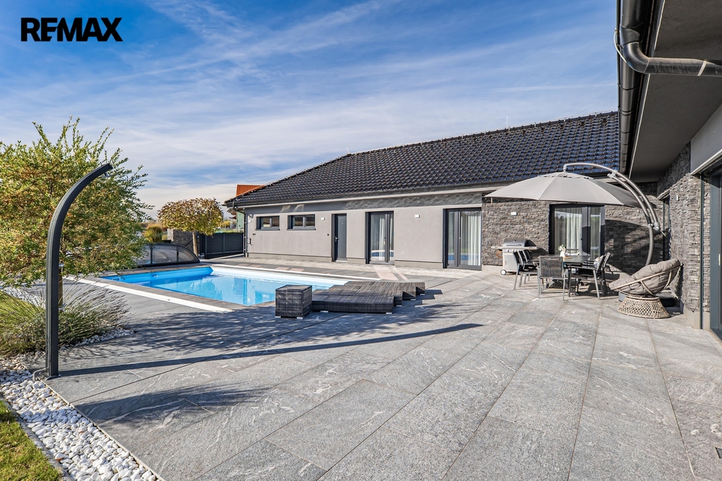 Na terase najdete dostatek místa pro venkovní posezení a grilování s výhledem na bazén, ideální pro relaxaci během horkých letních dní. Bazén značky ALBIXON má rozměry 8 x 4 m s hloubkou 1,5 m a byl instalován v roce 2022.