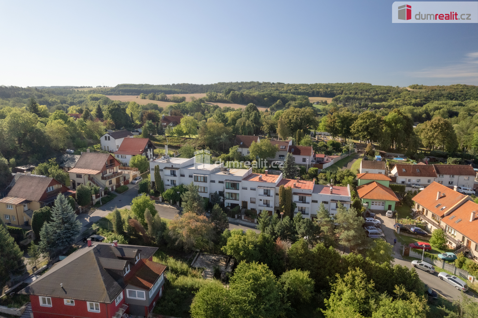 Ze zahrady se dá vyjít do ulice Na Vršku. A z vršku zahrady se dá rozhlédnout po přilehlých kopcích a střechách sousedních domů.