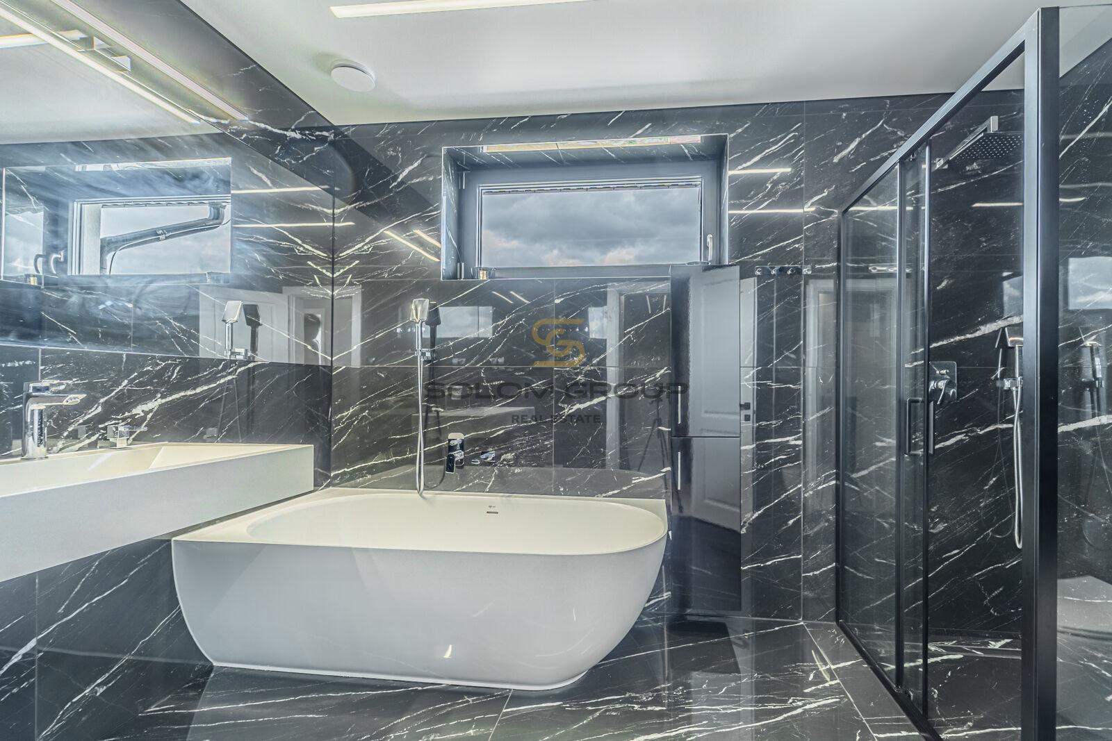 V patře domu jsou dva dětské pokoje, ložnice, posilovna, koupelna s vanou i sprchovým koutem a vstup na prostornou terasu.