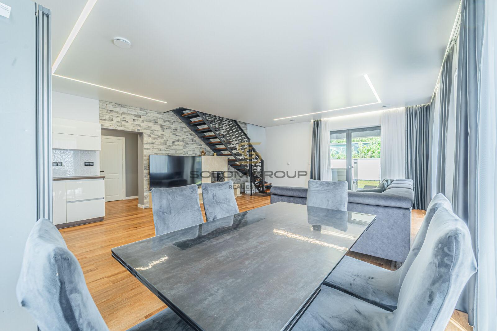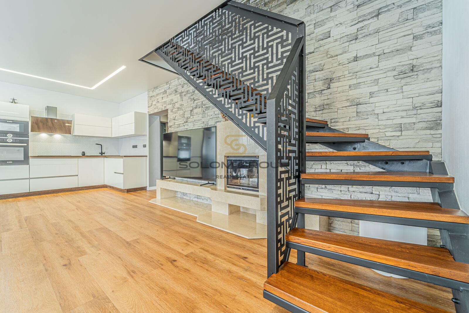 V přízemí domu s přímým vstupem na terasu se nachází obývací pokoj s krbem, kuchyňský kout s vestavěnými spotřebiči (indukční varná deska, digestoř, myčka, horkovzdušná a mikrovlnná trouba), dále koupelna se sprchovým koutem a toaletou, pracovna a technická místnost.