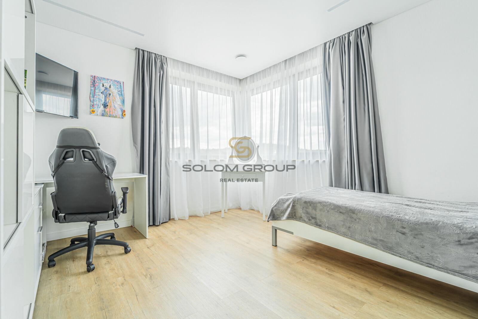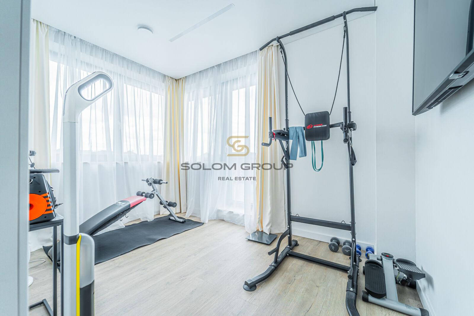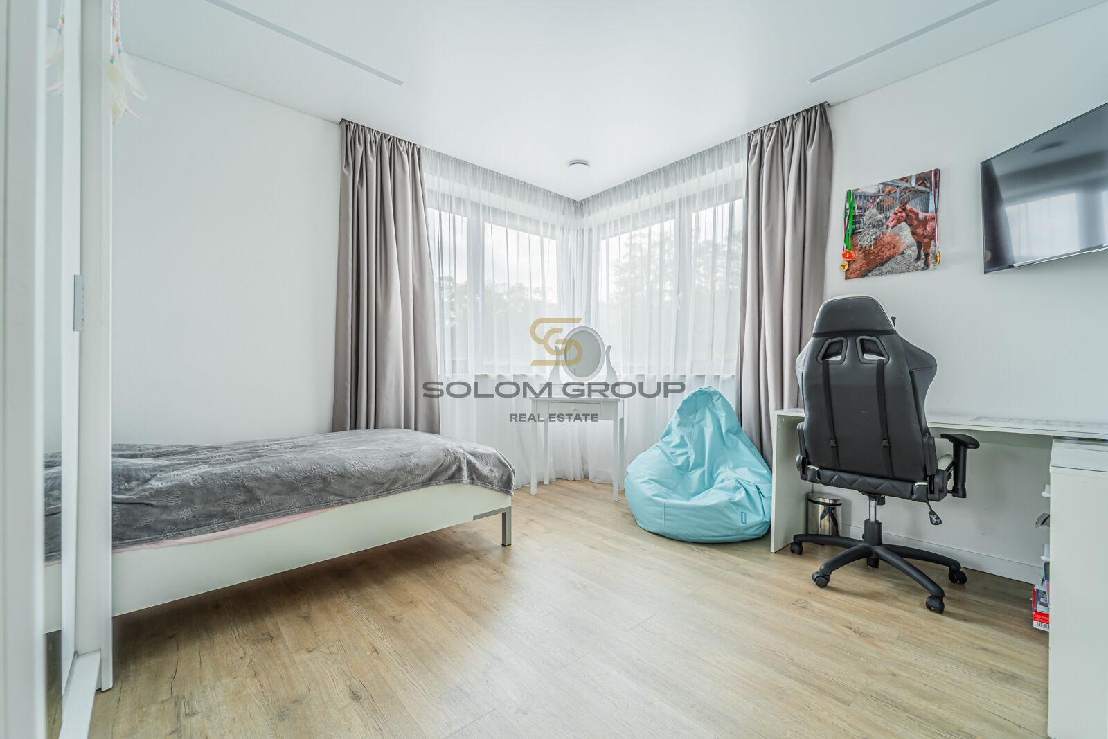 V patře domu jsou dva dětské pokoje, ložnice, posilovna, koupelna s vanou i sprchovým koutem a vstup na prostornou terasu.