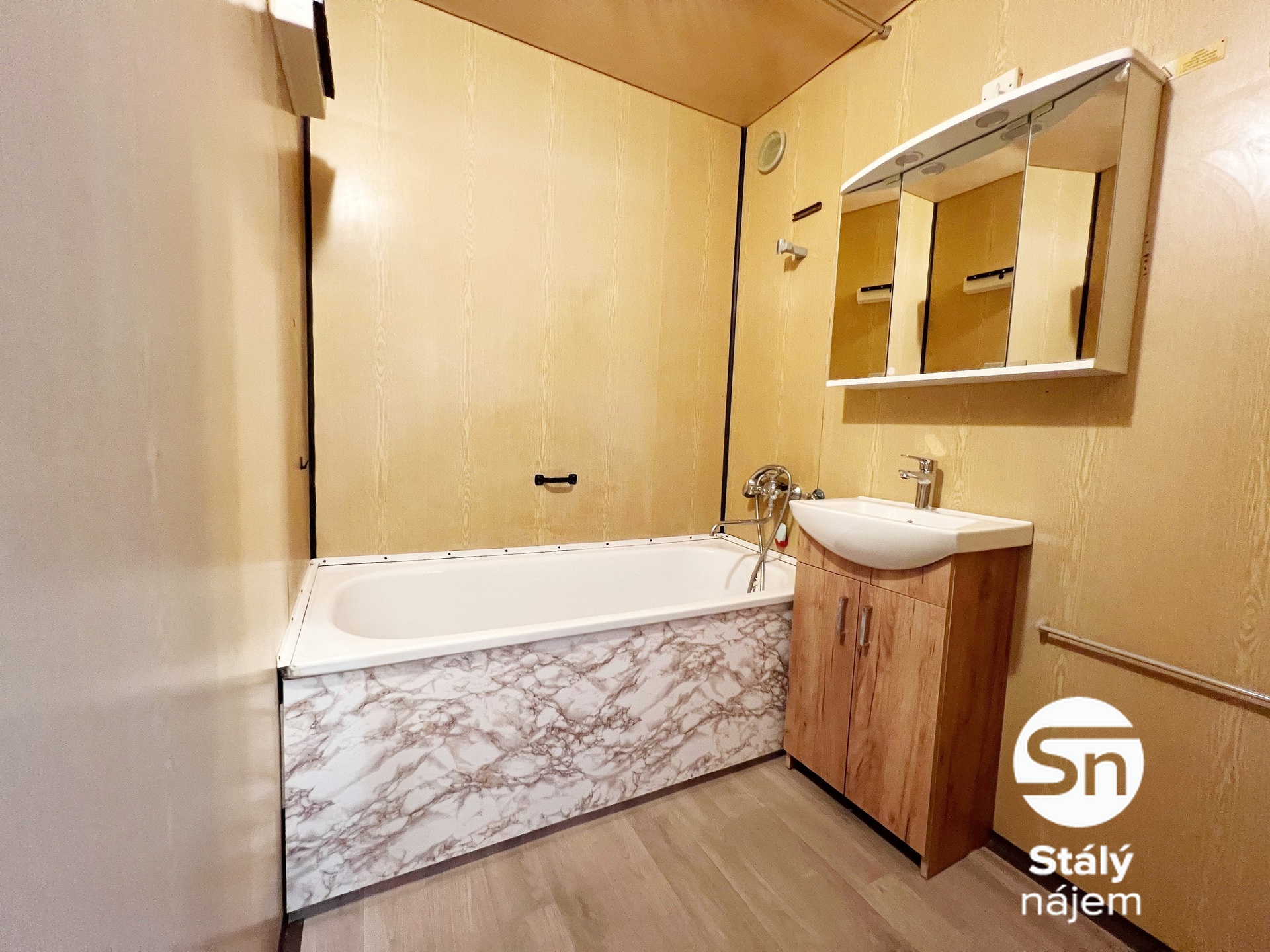 Součástí bytu je praktická kuchyňská linka v dekoru dřeva se spotřebiči, jako je elektrická trouba s plynovým sporákem, lednice a samostatný mrazák. V předsíni najdete dvě vestavěné skříně, botník a věšák, které zajišťují dostatek úložného prostoru. Koupelna je vybavena vanou, umyvadlem se zrcadlovou skříňkou, a toaleta je samostatná pro větší komfort.