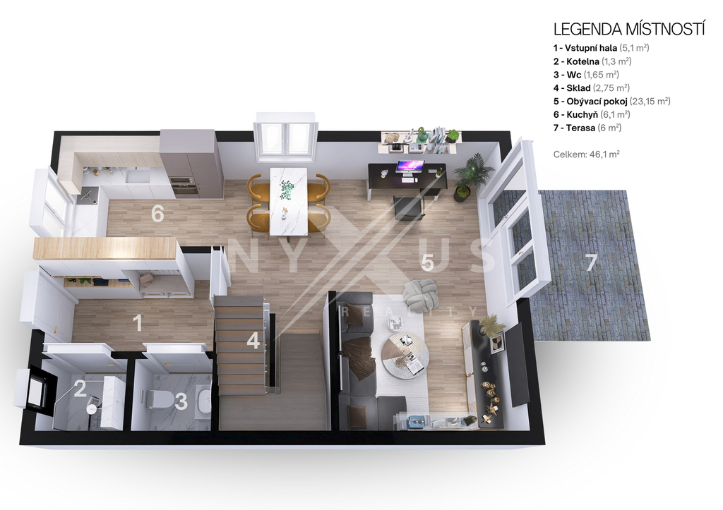 Z obývacího pokoje přímý vstup na terasu (6 m²) a zahradu (140 m²).