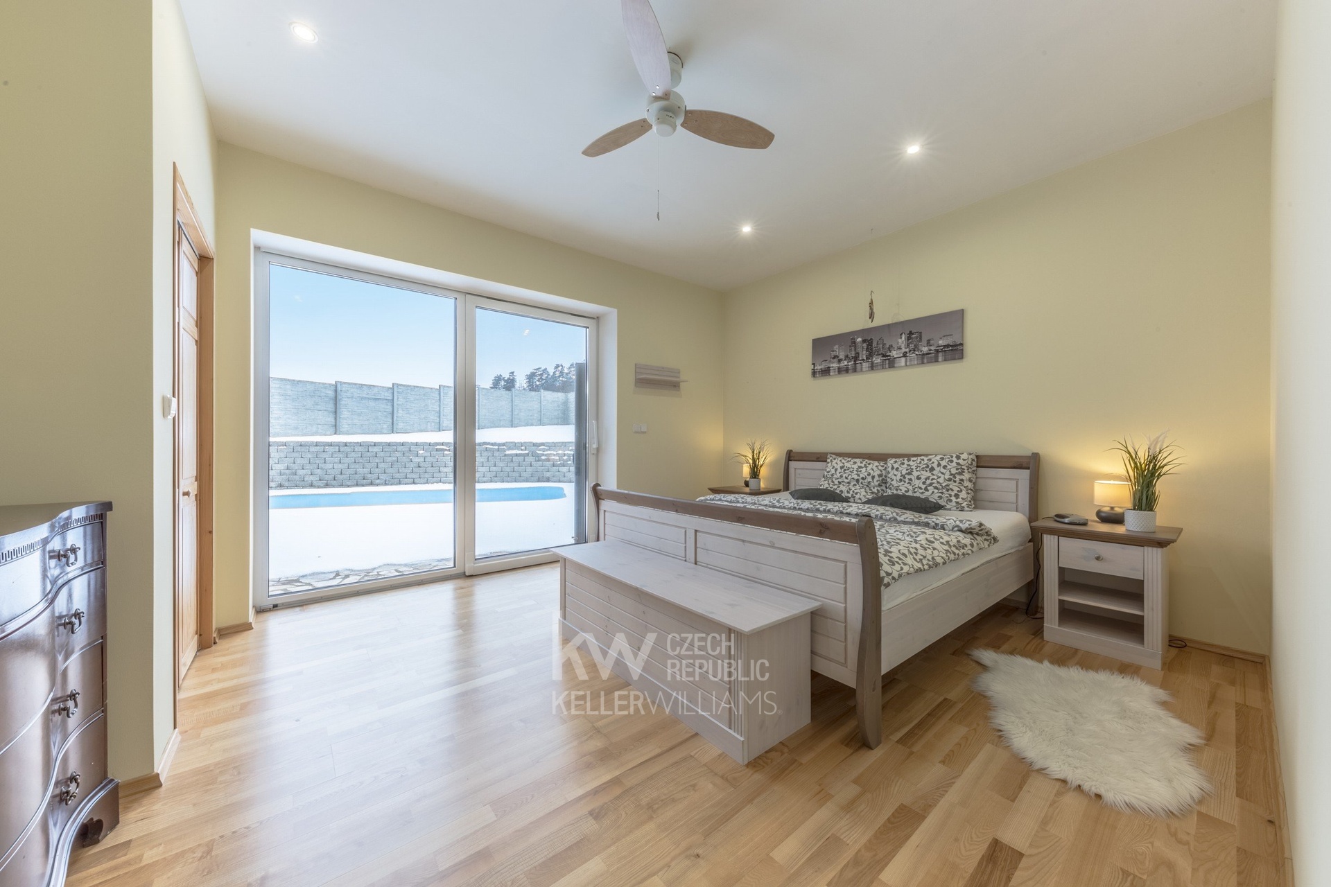 V klidové části domu naleznete hlavní ložnici, která nabízí skutečný luxus v podobě přímého vstupu k bazénu. Rannímu plavání tak nestojí nic v cestě. Dále je zde útulný dětský pokoj a pracovna (vznikla částečnou úpravou garáže), dvě elegantní koupelny a technická místnost.