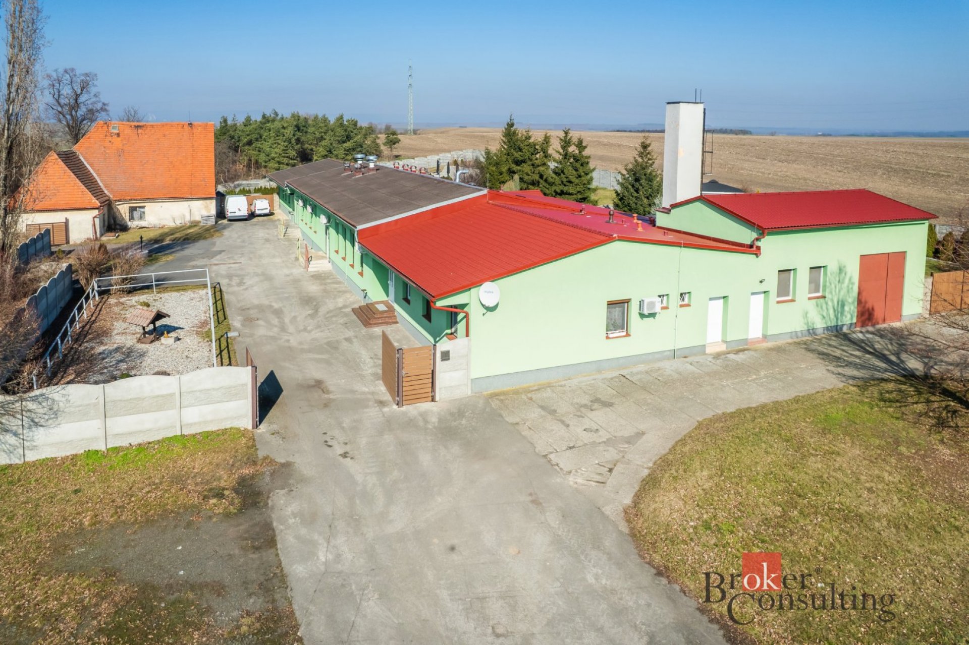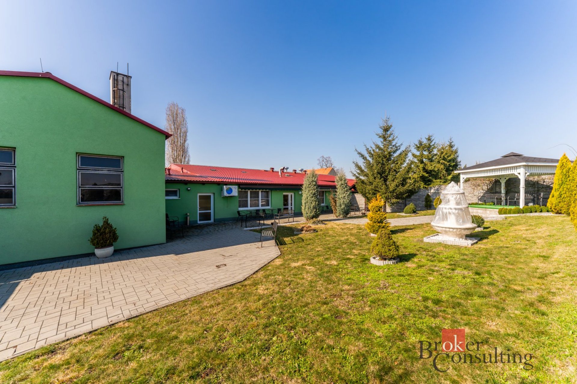 Areál tvoří uzavřený celek s vjezdem přes bránu a velkou zpevněnou plochou sloužící jako dvůr, parkování pro hosty i prostor pro zásobování. Součástí je také rozlehlý pozemek s upravenou zahradou a venkovním zázemím. Dominantou zahrady je krásný dřevěný altán, který vytváří ideální místo pro venkovní posezení, svatby, rodinné oslavy či firemní akce.