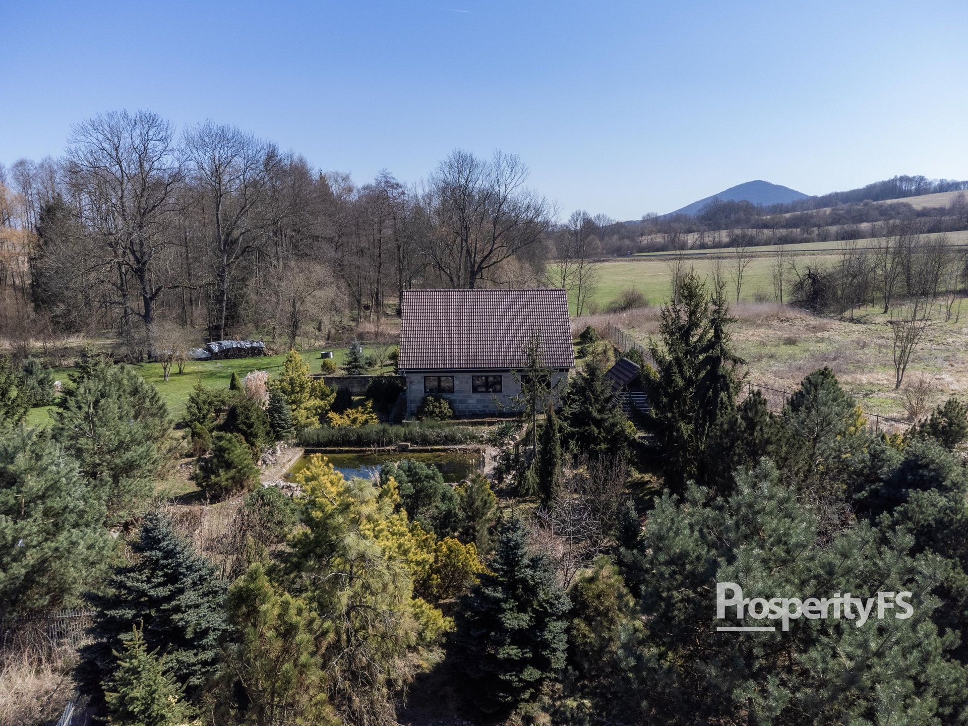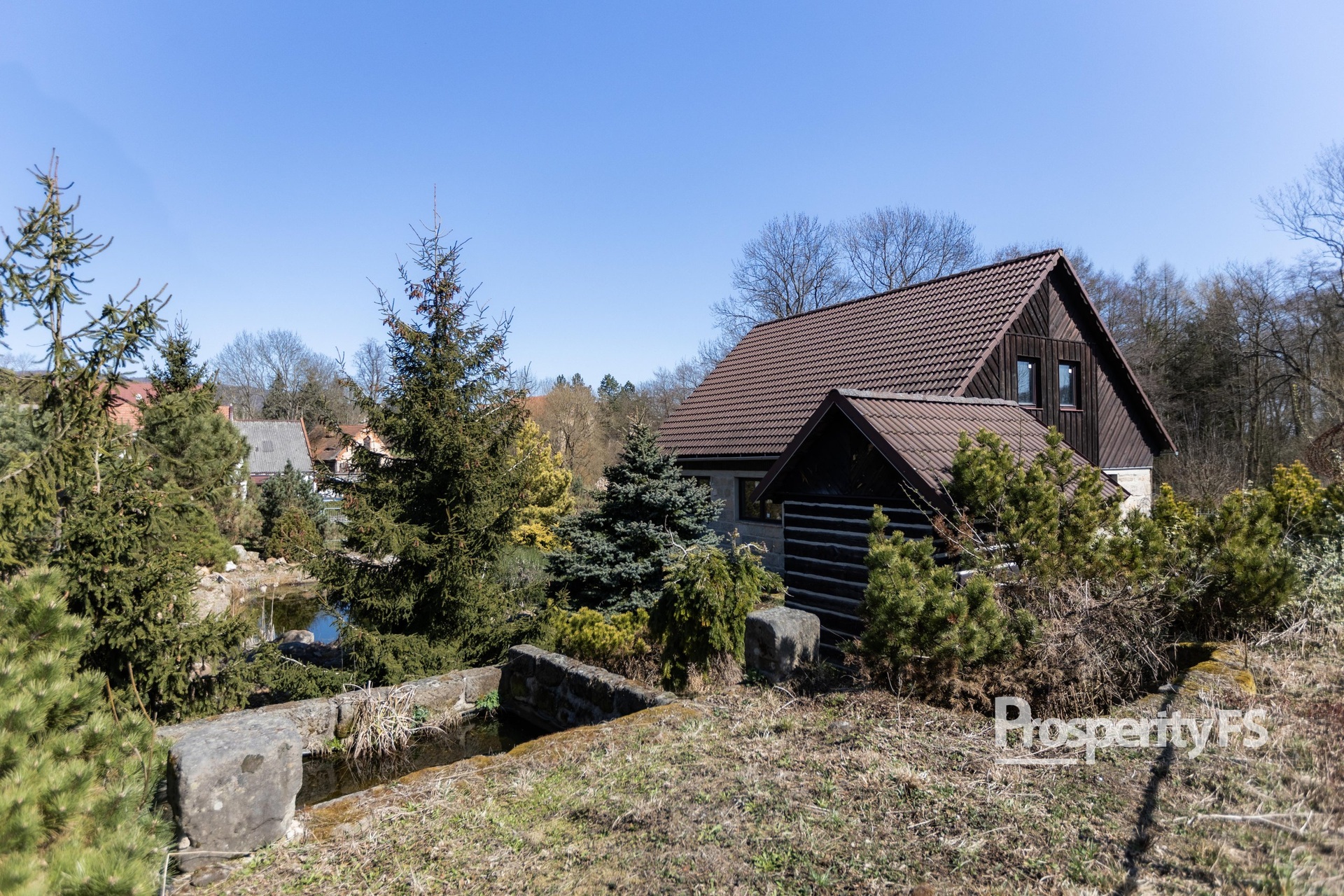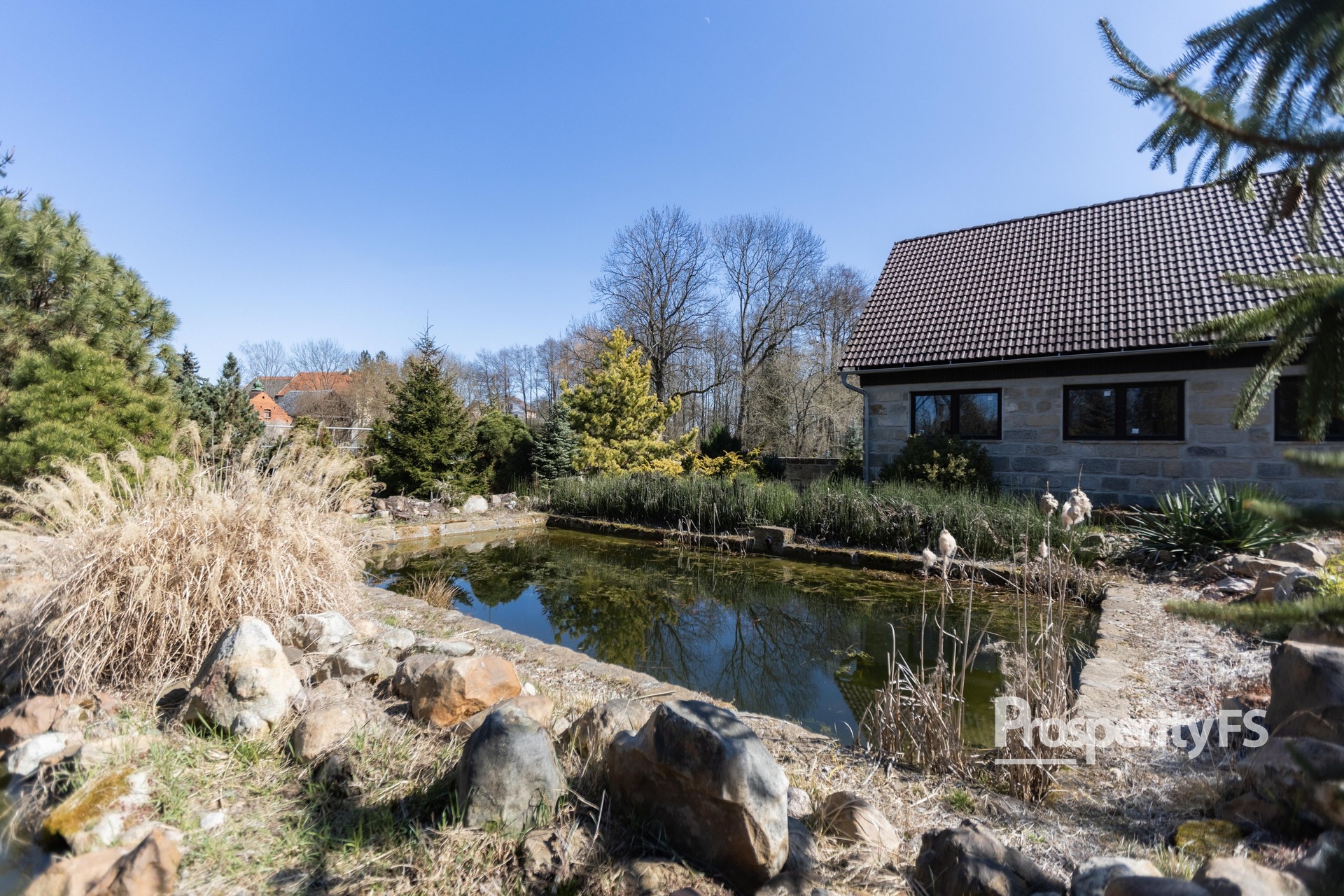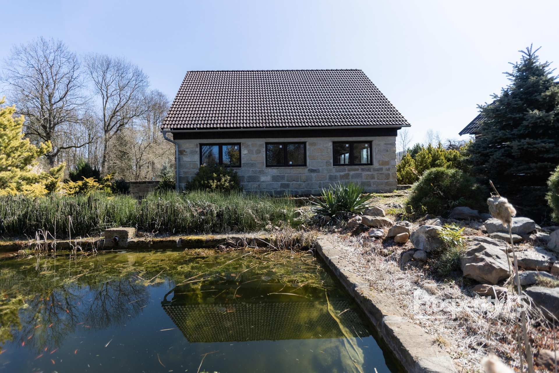 Okrasná zahrada je bezesporu jedním z nejvýraznějších prvků celé nemovitosti. Je pečlivě navržena i udržována a poskytuje nejen reprezentativní vzhled, ale také naprosté soukromí a prostor k relaxaci. Hlavní dominantou je jezírko s rybami, doplněné o další menší vodní plochy s lekníny, které dotvářejí klidnou a přírodní atmosféru. Jedno z jezírek je umístěno ve starém pískovcovém sklepě, čímž získává prostor unikátní charakter. Zahradu dále tvoří skalky, výrazné okrasné kameny, různé druhy trav, jehličnany, keře a vzrostlé dřeviny.