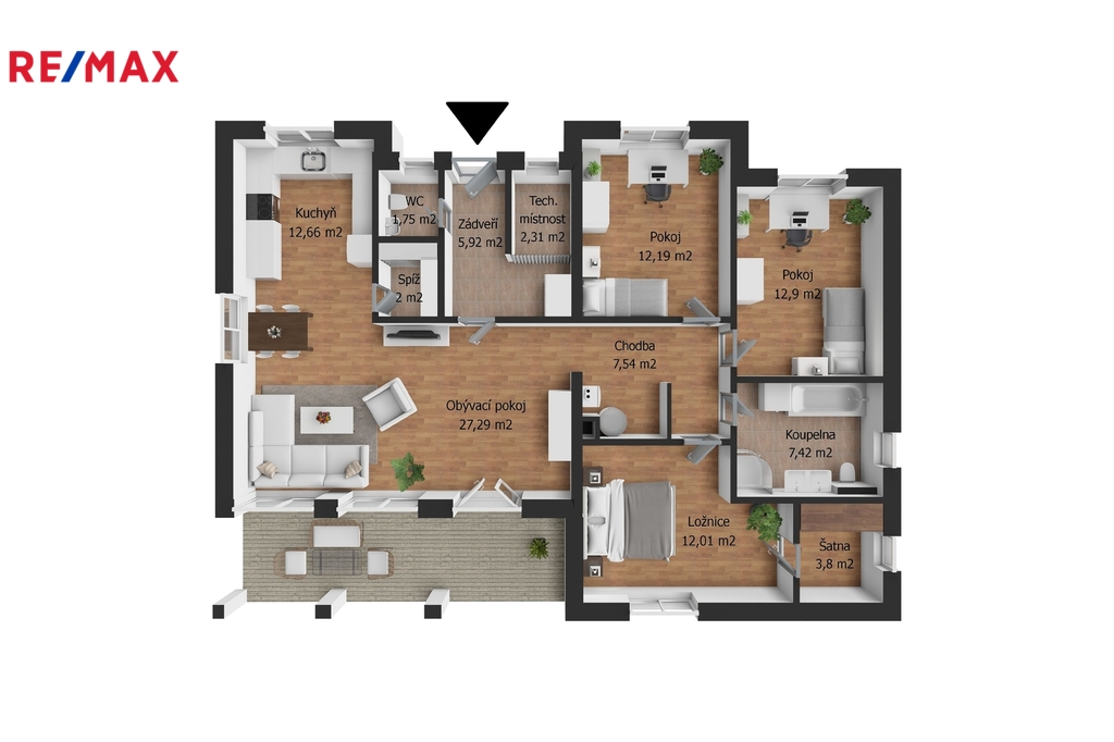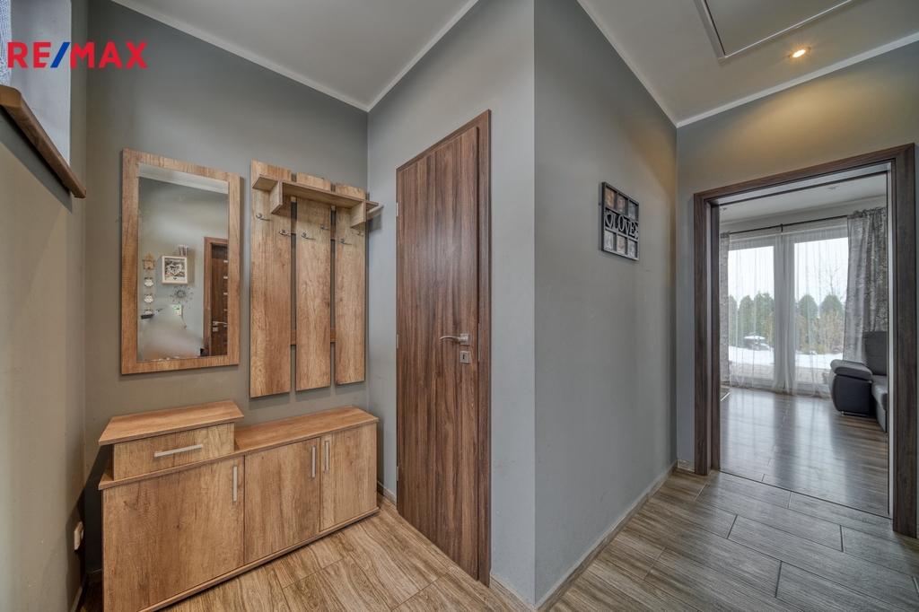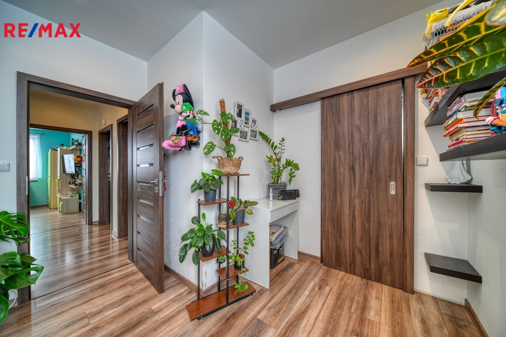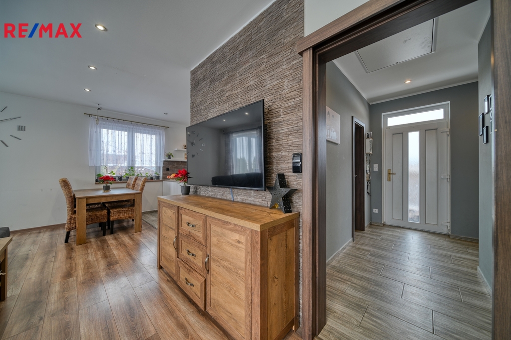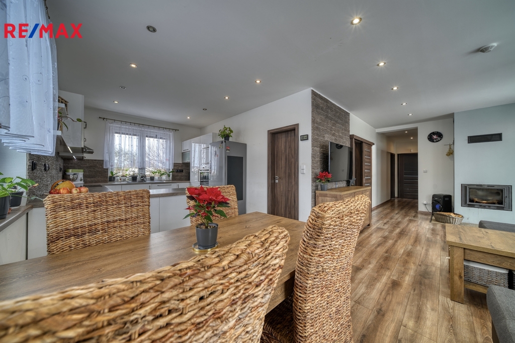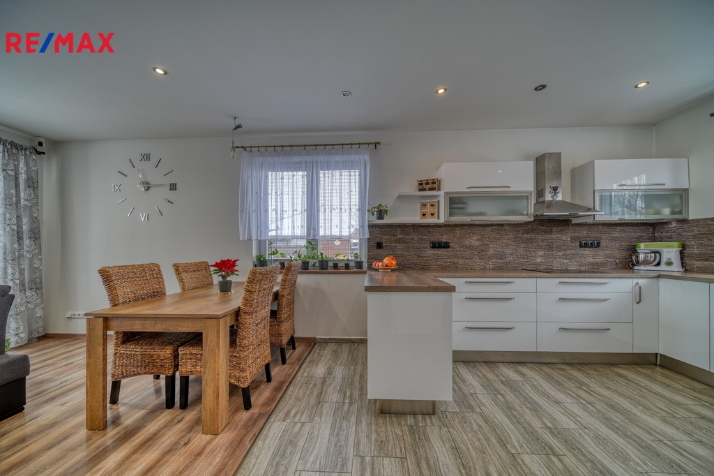 Praktická dispozice 4+kk nabízí prostorný obývací pokoj propojený s kuchyní. Kuchyňská linka je vybavena vestavěnými spotřebiči – indukční varnou deskou, troubou i digestoří – a doplněná o velmi praktickou spíž.