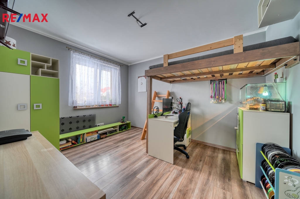 Dále zde najdete dva dětské pokoje, ložnici s vlastní šatnou, prostornou koupelnu s vanou, sprchovým koutem a WC. Druhé WC je samostatné.