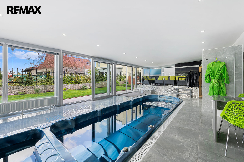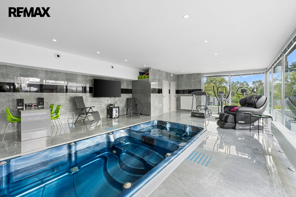 Na zahradě se nachází samostatná budova s vlastním wellness, kde kromě sauny, vířivky až pro 6 osob, je i bazén s protiproudem, prostor pro cvičení a relaxaci, menší kuchyň, šatna a veškeré sociální zázemí. Stejně jako v domě, i zde je díky materiálovému provedení a prosklení ze tří stran světlost a moderní vzhled. Rekuperační jednotka zajišťuje řízené větrání v hlavním prostoru.