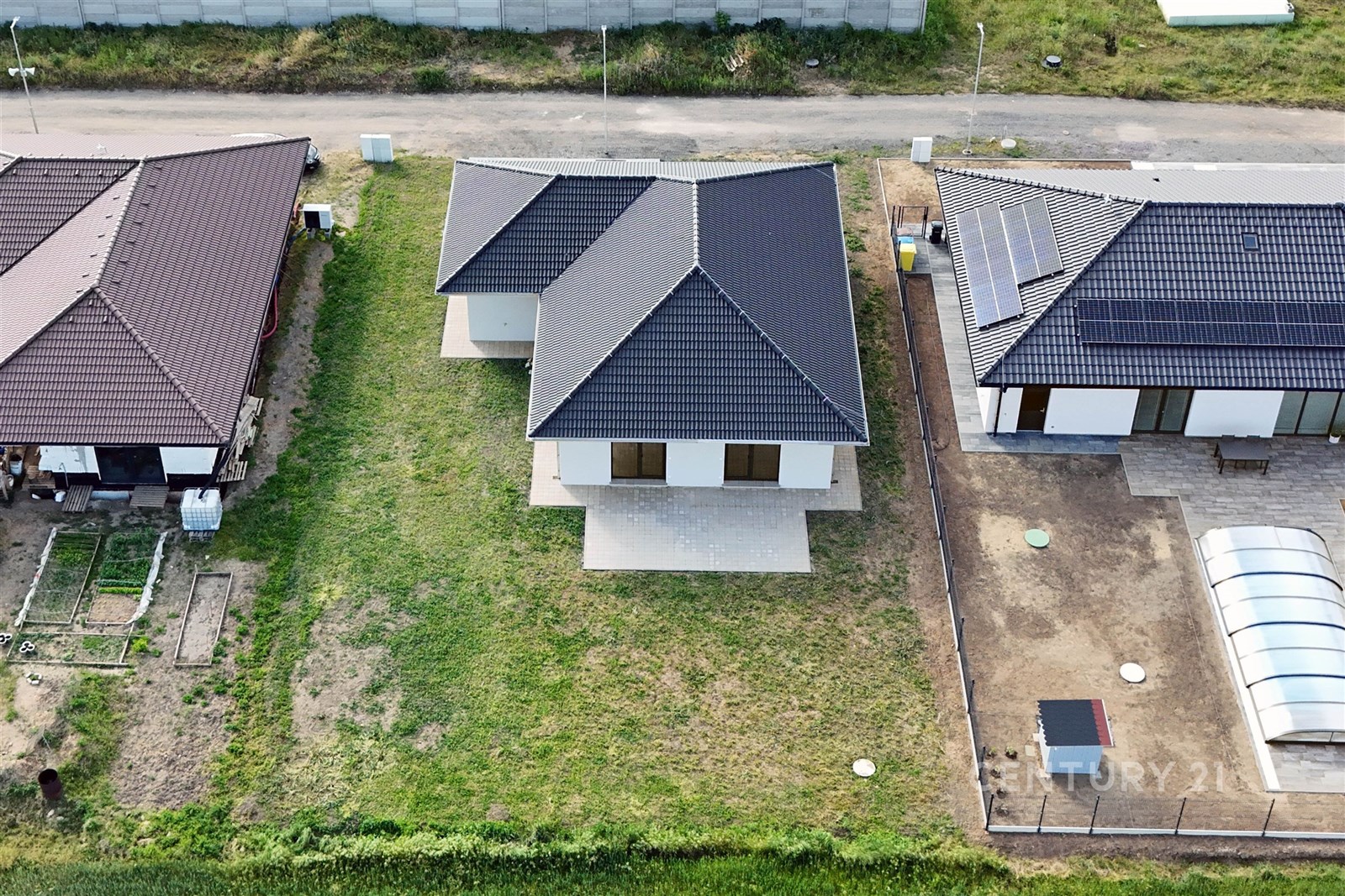 Všechny chodníky i terasa jsou hotové, střecha má praktický přesah – kolem domu se dá pohodlně chodit suchou nohou i za deště
